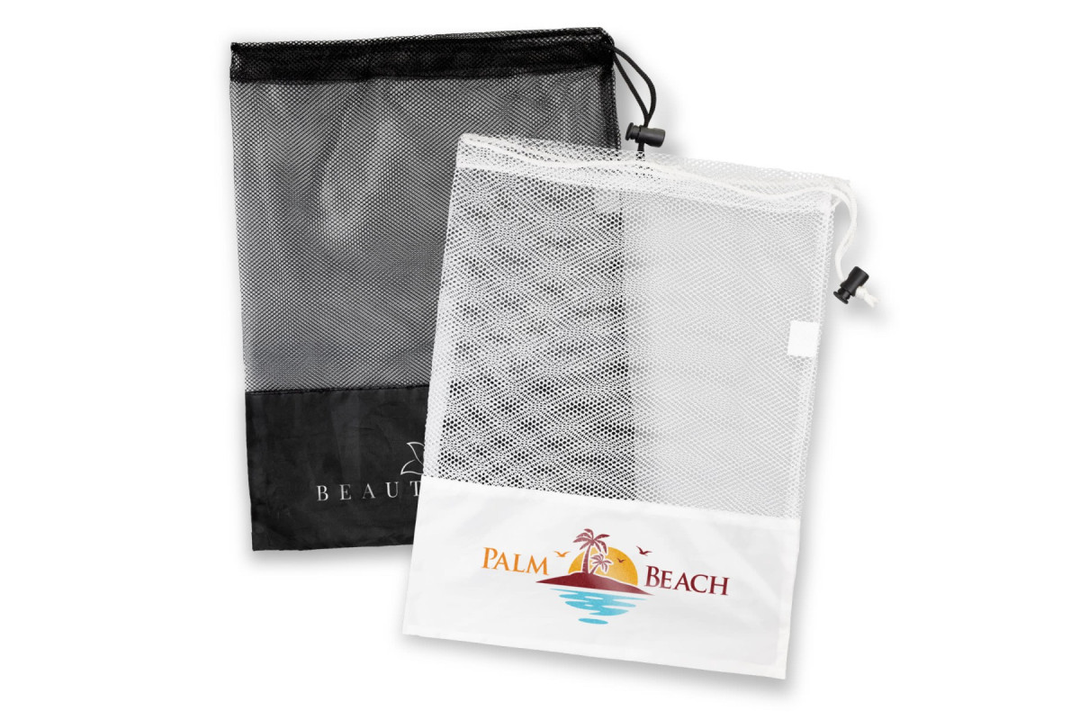 Drawstring bag which is manufactured from Mesh and 190T Polyester. It features an insert at the bottom and a drawstring at the top to keep belongings secure inside it. Because it uses mesh, the bag is breathable as well as being the perfect size for storage, to put your laundry in whilst travelling or as a convenient shoe bag when your out and about.