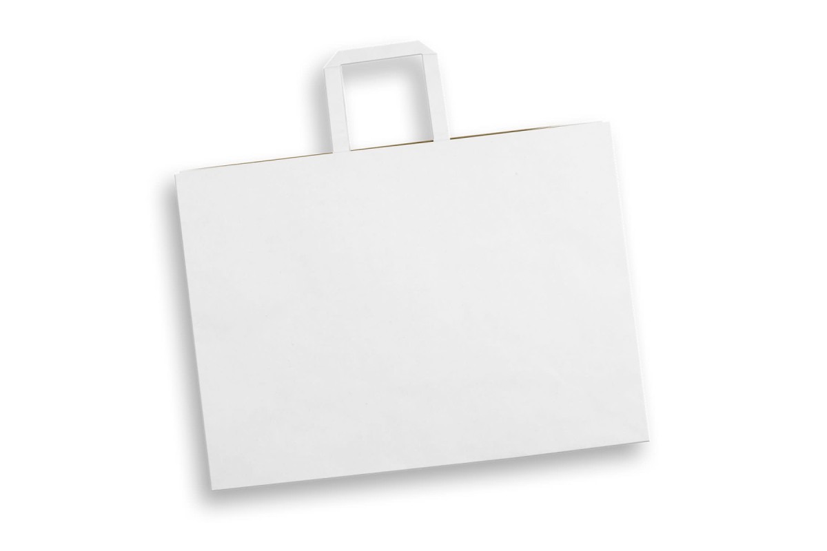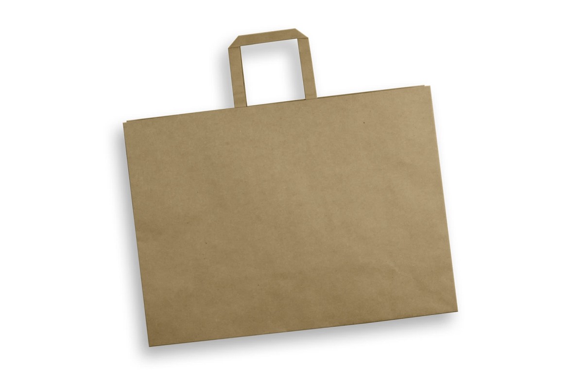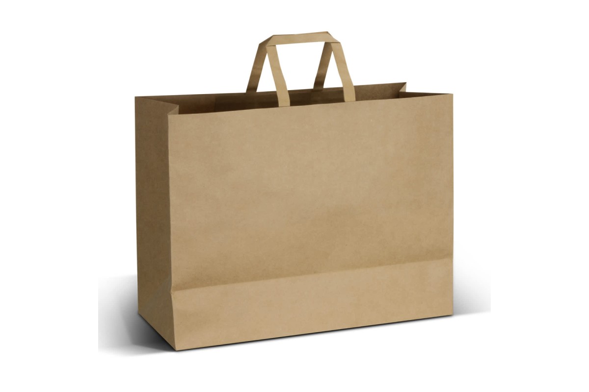Extra large carry bag made from 180gsm paper materials with a reinforced base and square-folded 100gsm paper handles. This bag is landscape orientated with handles and gusset along the longer edges. Features: * Carry bag made from 180gsm paper * Square folded 100gsm paper handles * Reinforced base * Landscape orientation