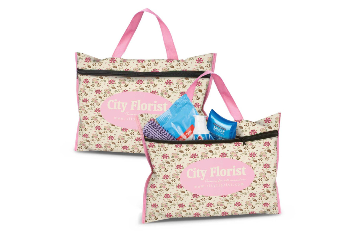 Large toiletry and cosmetics bag with a handle which is manufactured from 140gsm cotton and is branded in spot colour or full colour on both sides at no extra cost. It has a black zippered closure and binding on the edges for added strength. The handles, binding and stitching are available in 16 colours which will match unless requested otherwise. A production lead time of 20 working days applies to this product by air freight and larger orders can be sea freighted on request to reduce the freight cost.