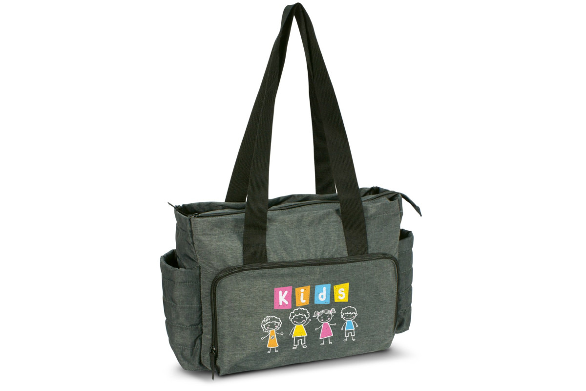 Luxury baby bag which is manufactured from trendy 190T patterned dobby polyester with a pongee lining. It features a heavily padded main compartment with a zippered closure which has one large padded inner pocket and two smaller unpadded pockets. Kinder has a large external pocket with a Velcro closure on one side and a large zippered external pocket with two inner pockets on the other. It has a removable foam-filled changing pad with a water-resistant PEVA surface that is easily wiped clean or washed. Other features include two padded end pockets for bottles and long woven handles so it can be carried on a shoulder.