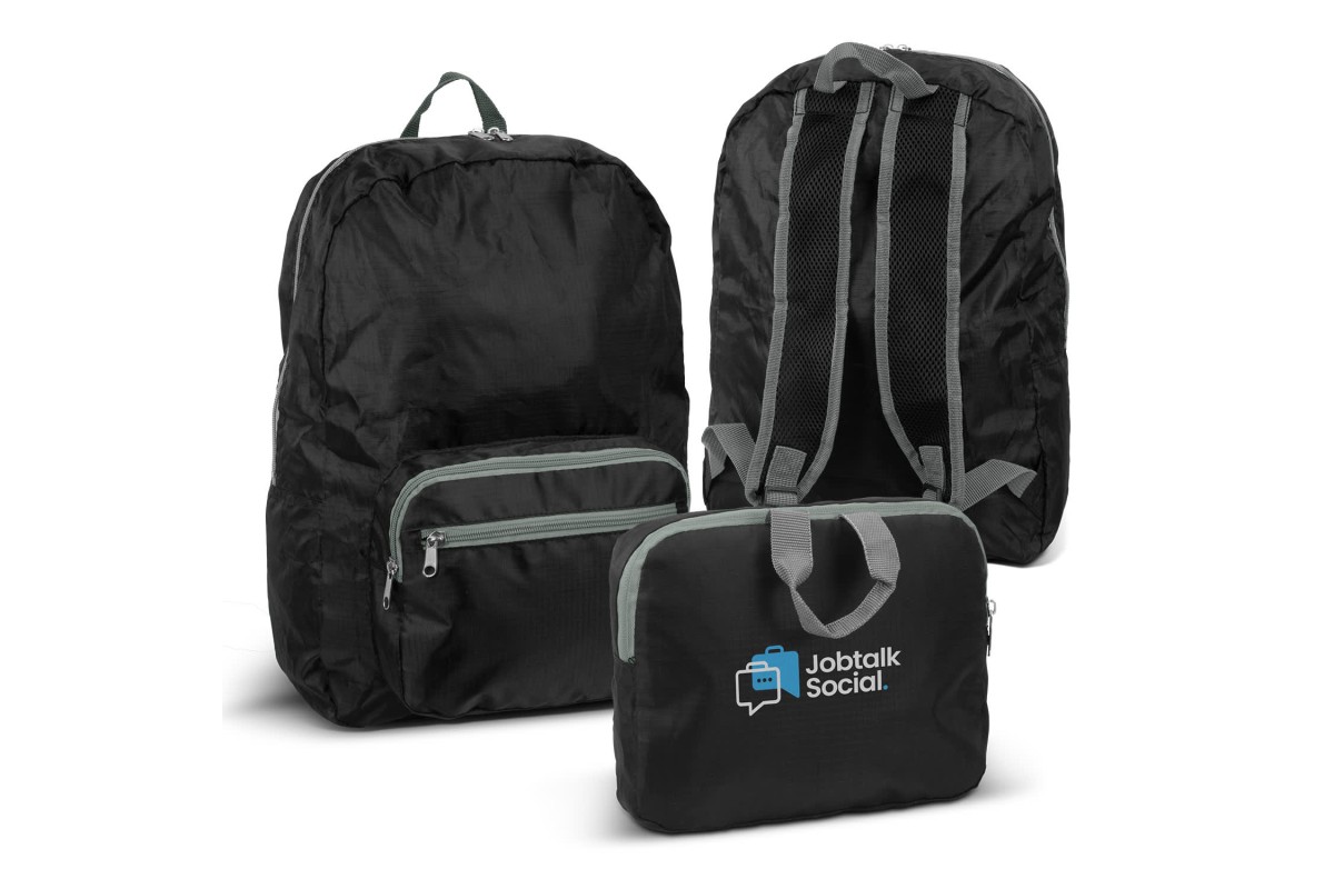 Handy 16L backpack made from durable 210D ripstop polyester and features lightly padded and adjustable shoulder straps. When not in use, the backpack can be folded away into a small carry pouch, making it perfect for travel. The pouch is discreetly zipped away into the bag when the backpack is in use. This lightweight backpack has a large zippered main compartment, as well as two additional zippered pockets in the front.