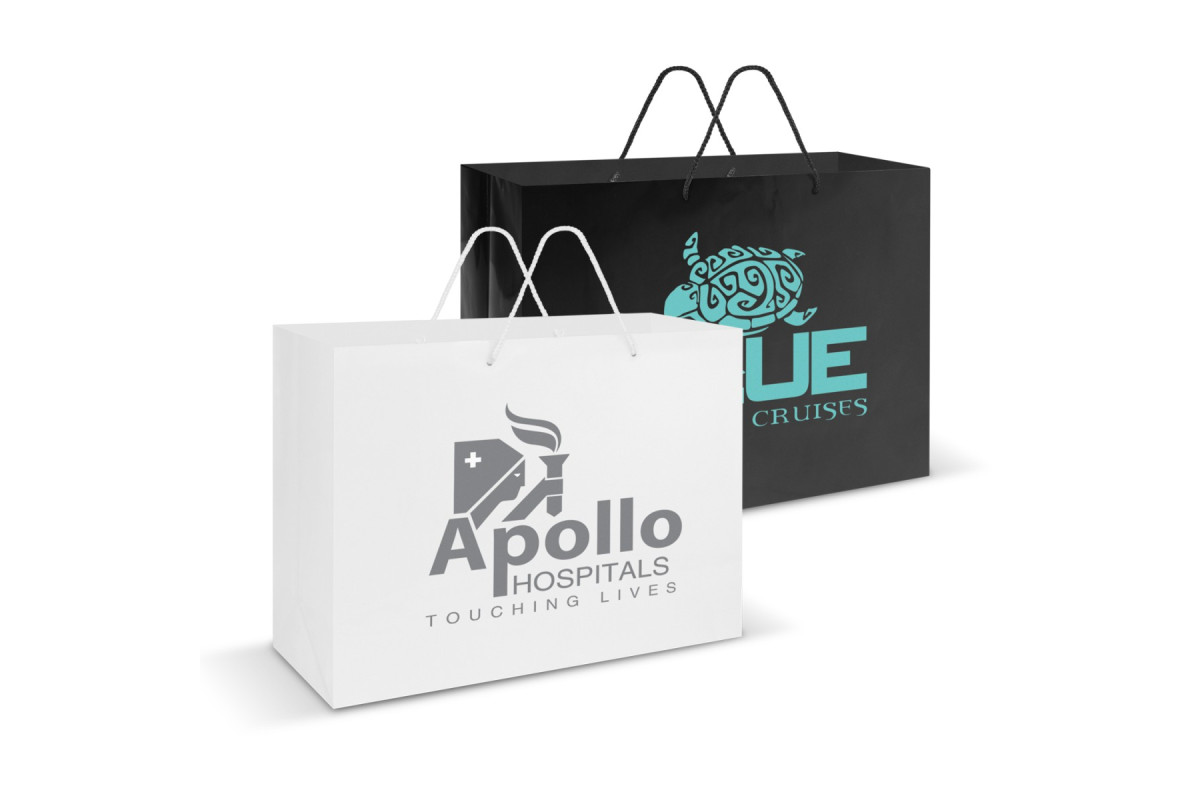 Extra-large carry bag with strong woven polypropylene rope handles. It is manufactured from gloss laminated 157gsm art paper.