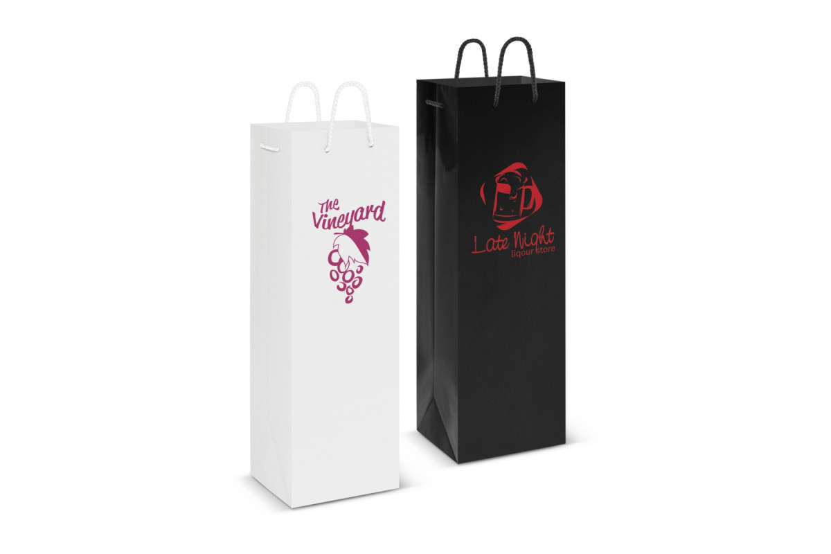 Laminated wine carry bag with strong woven polypropylene rope handles. It is manufactured from gloss laminated 157gsm art paper.