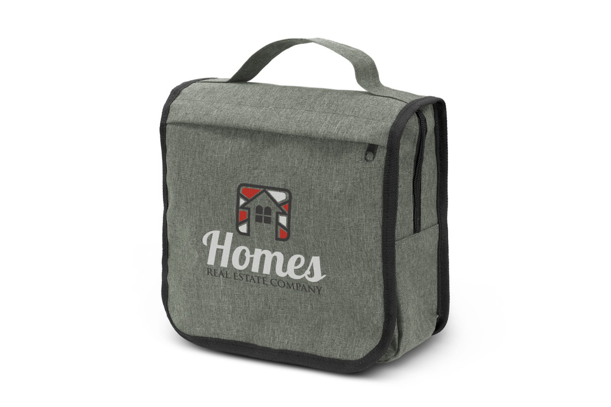 Lightweight toiletry bag with a two-tone heather style fabric finish and plenty of storage. It is manufactured from 300D polyester with a 210D polyester lining. Knox features a Velcro closure, two zippered mesh pockets and a zippered main compartment with a mesh window. It also has an external zippered pocket, a carry handle and a handy hook.
