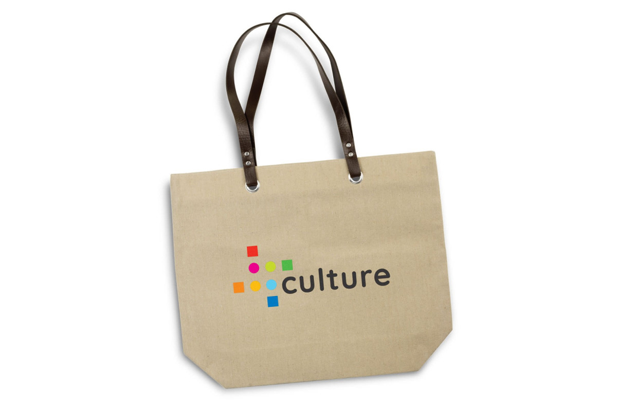Classic 15L tote bag which is manufactured from 250gsm natural linen with brown leather-look PU long carry handles.