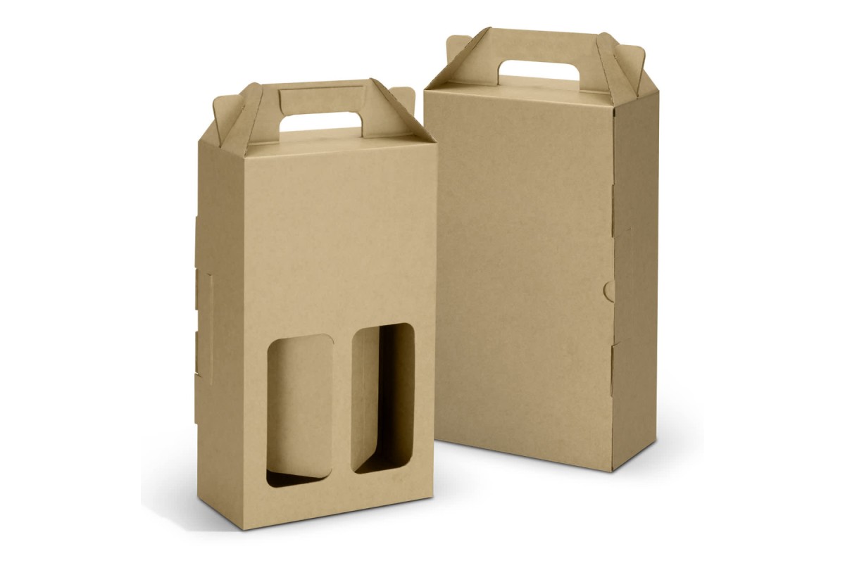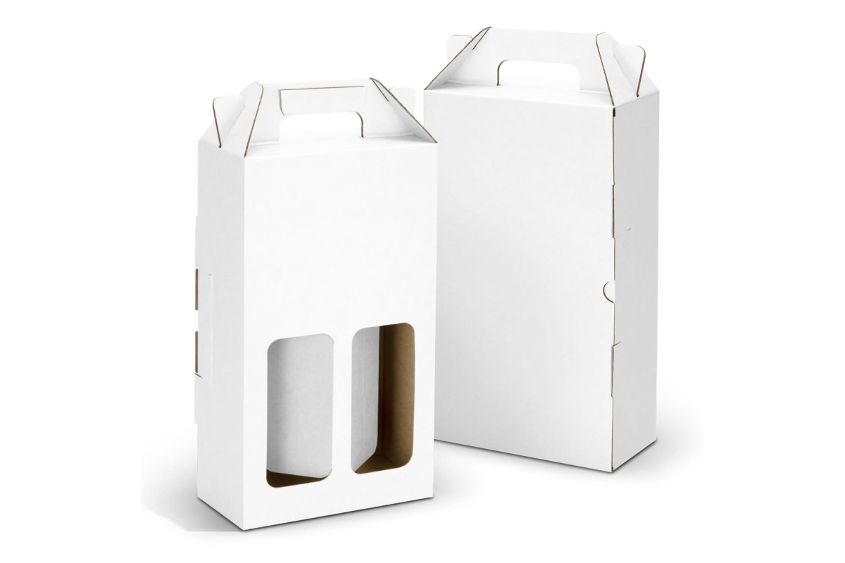 Professional custom wine presentation box made from durable 1.5mm e-flute corrugated cardboard with display windows. This box holds two standard wine bottles, perfect for gifting and building strong brand recognition. Featuring a convenient carry handle, the box's exterior can be customised with CMYK digital print. It is supplied flat-packed for easy postage and storage, and its self-locking design ensures hassle-free assembly. The assembled dimensions are 177mm x 88mm x 335mm (LxWxH). Features: * Smart wine presentation box with carry handle * Die cut from strong 1.5mm e-flute corrugated cardboard * Customisable exterior with CMYK digital print * Fits two standard wine bottles * Easy to assemble with self-locking design * Assembled dimensions: 177mm x 88mm x 335mm