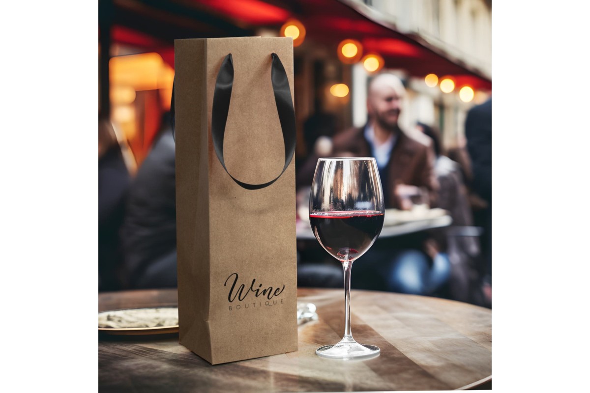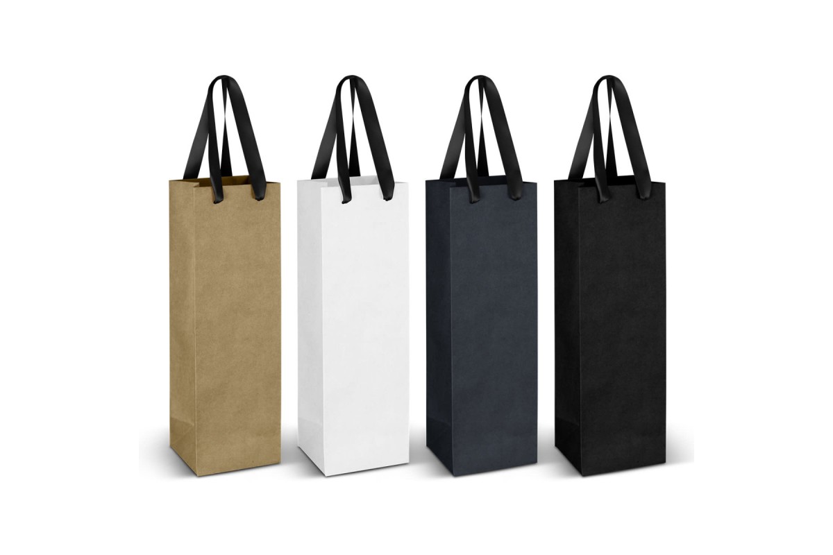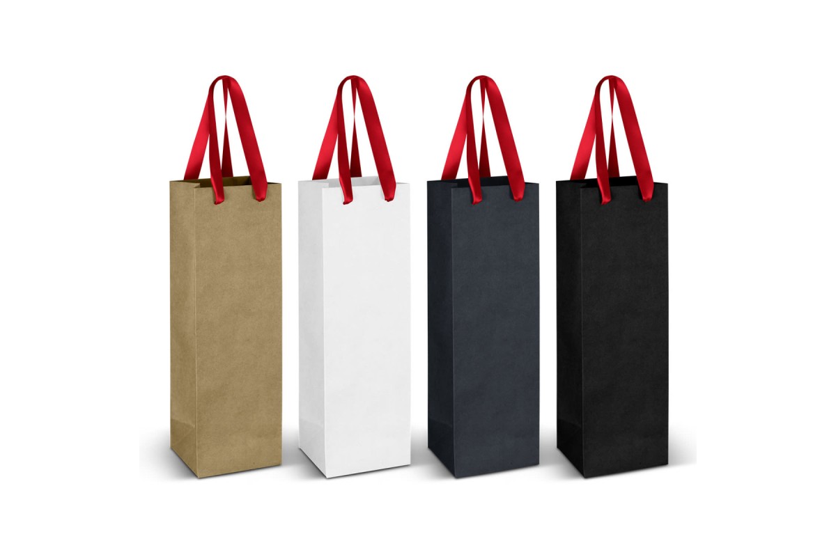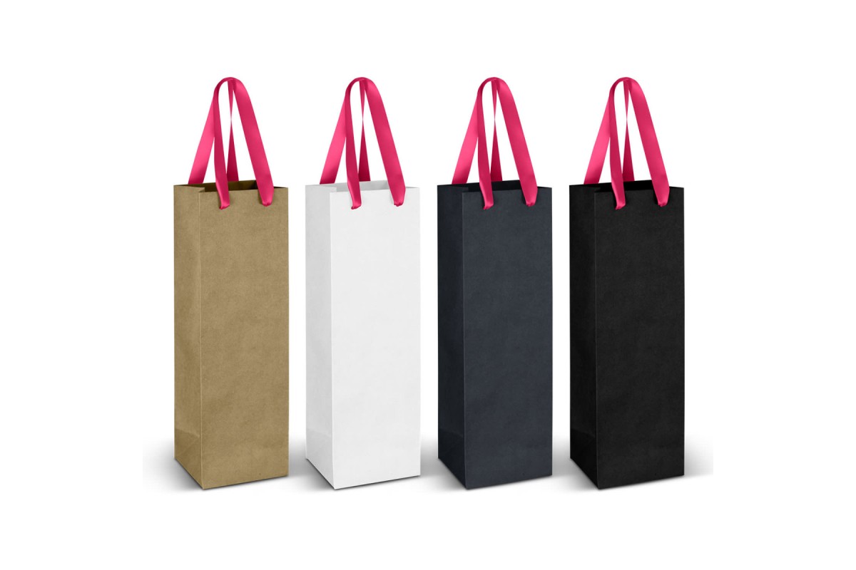 Wine carry bag made from 180gsm paper with coloured ribbon handles. The gusset and top edge are reinforced for added strength. This bag is perfect for wine gifting or presentation.