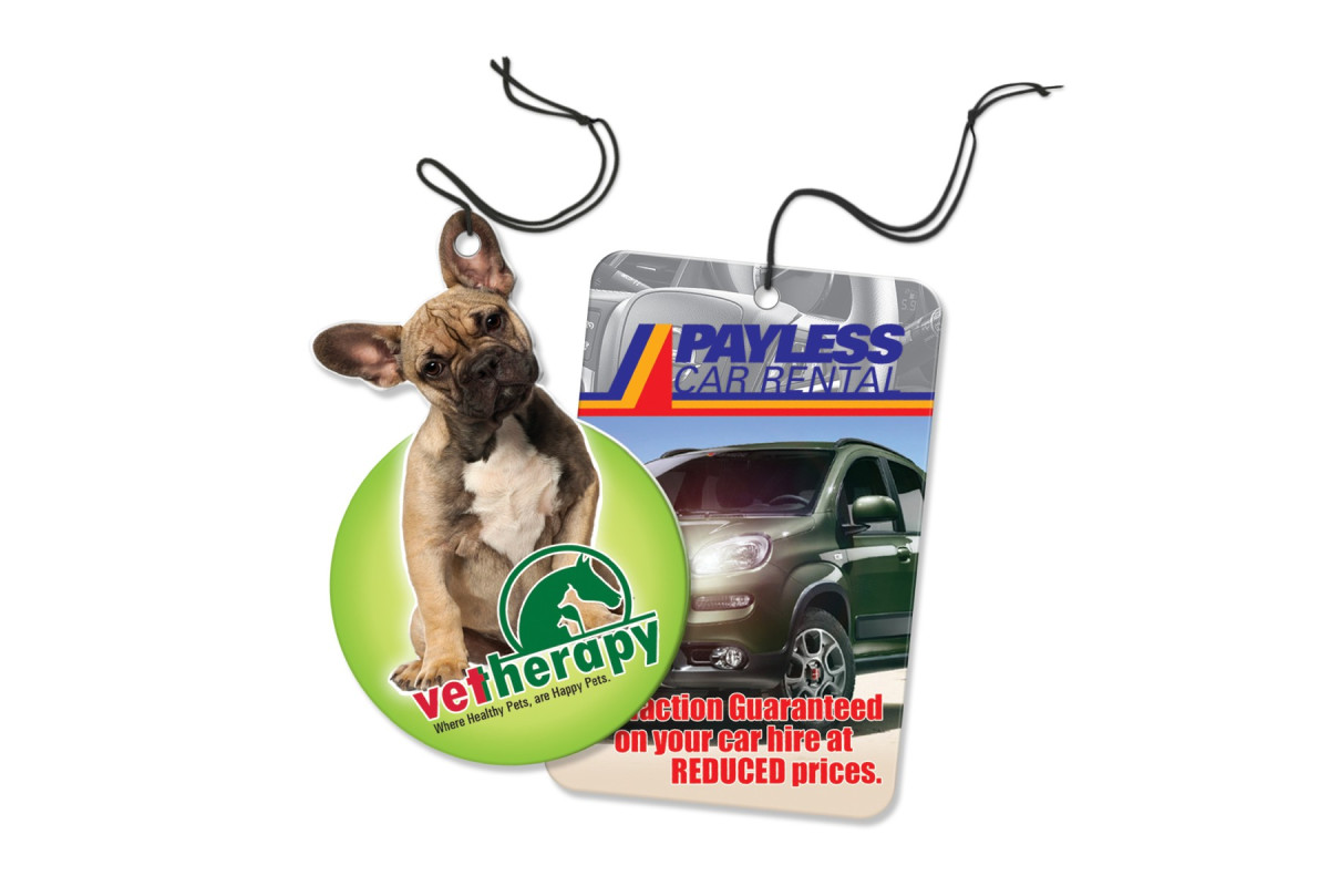 Cardboard air freshener for cars which can be stored for 12 months unopened. Choose from Pine, Lavender, New Car, Vanilla, Musk, Forest, Ocean Scent and Strawberry fragrances. The price includes one fragrance and if multiple fragrances are required, an additional setup charge applies to each extra fragrance. Custom shapes and sizes are available on request. A production lead time of 25 working days applies to this product by air freight and larger orders can be sea freighted on request to reduce the freight cost.
