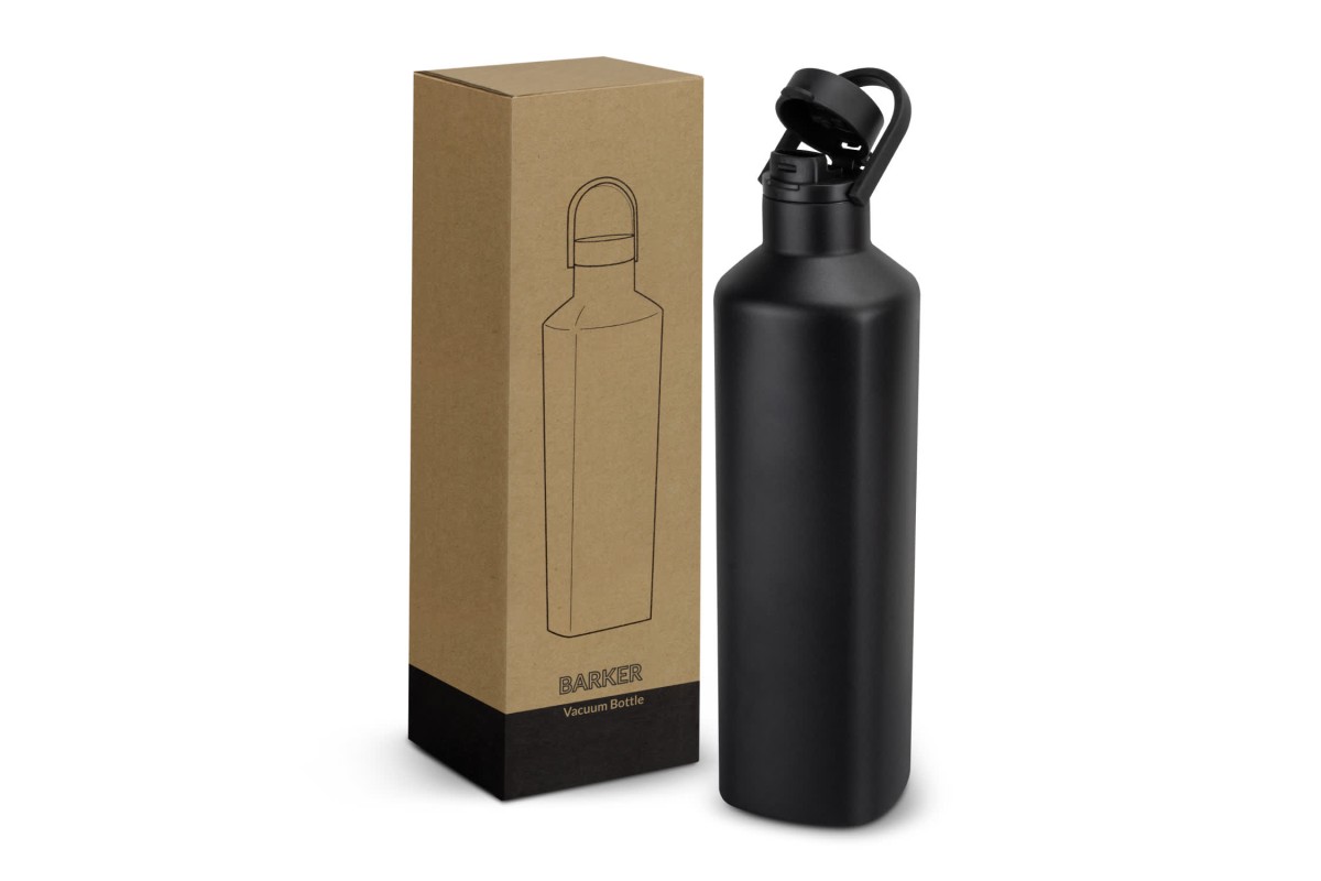 Eye-catching 740ml drink bottle made from stainless steel with double walled vacuum insulation and a tough powder coated finish. Featuring a distinctive, square design, Barker has a secure screw-on lid with a flip cap and a convenient carry handle. This unique bottle is presented in a printed natural gift box.