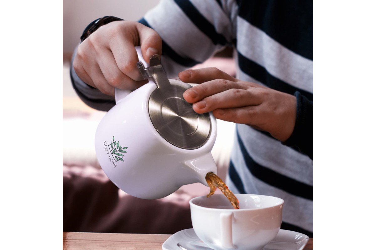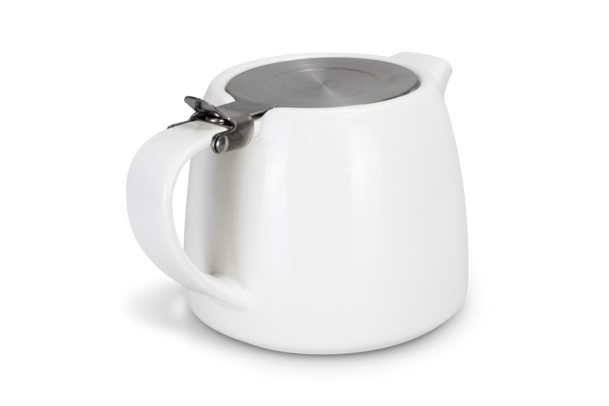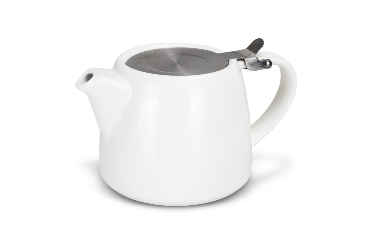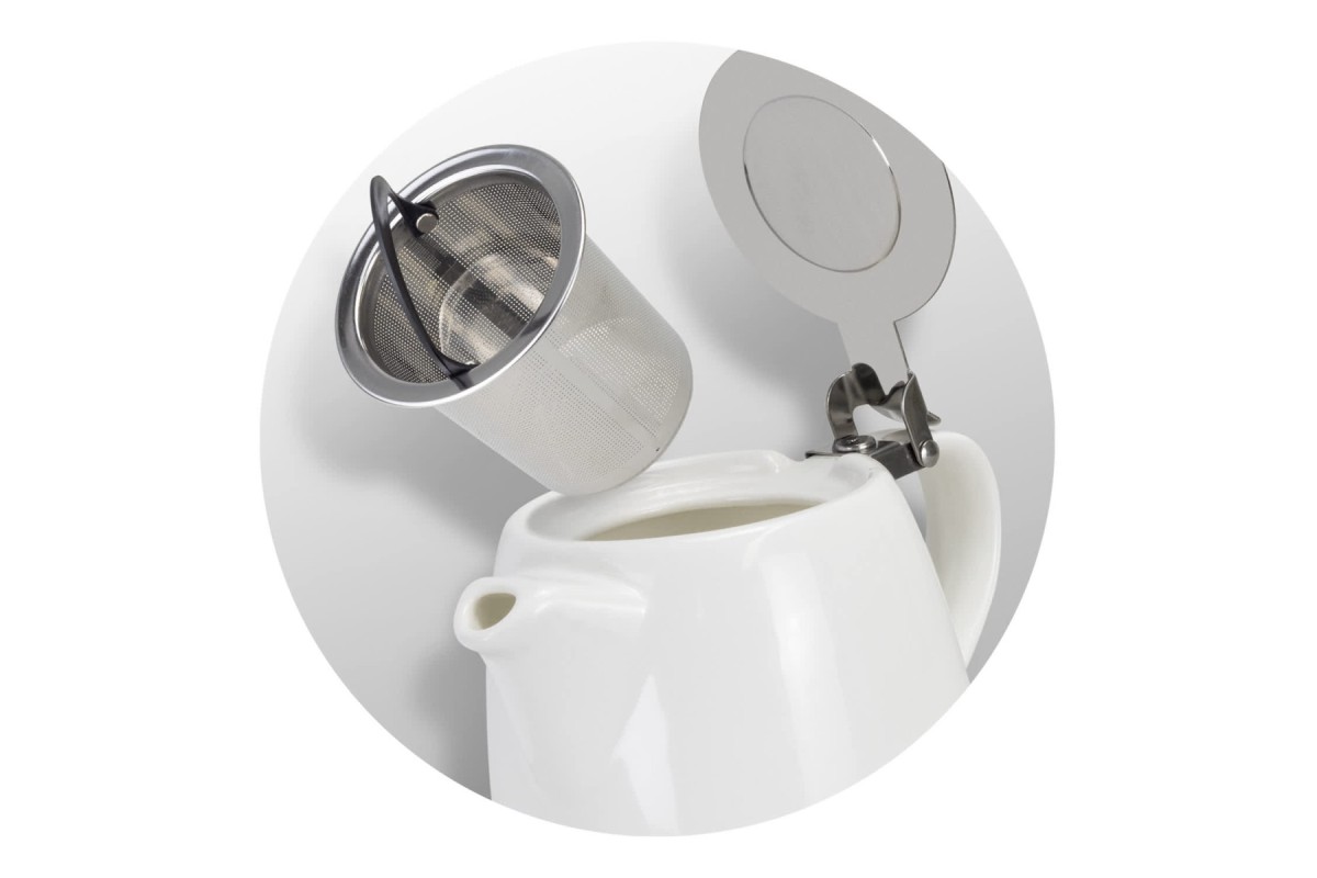 490ml glossy stoneware teapot with a stainless steel flip lid and removable tea infuser. This versatile teapot is perfect for hospitality and is presented in a white gift box.