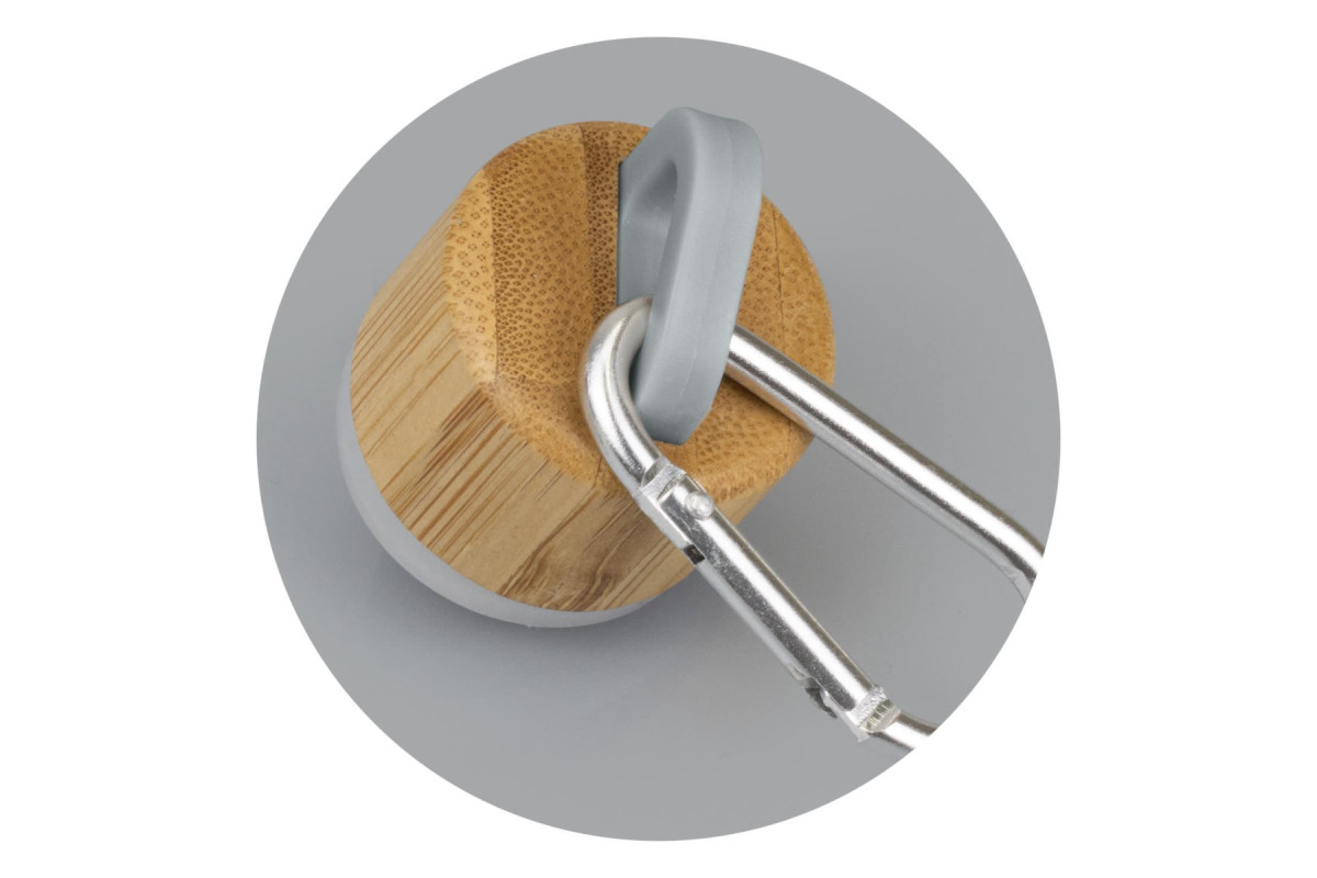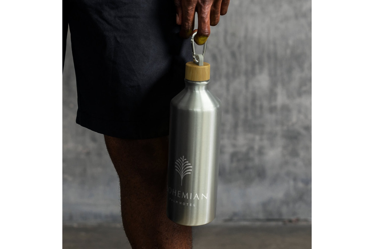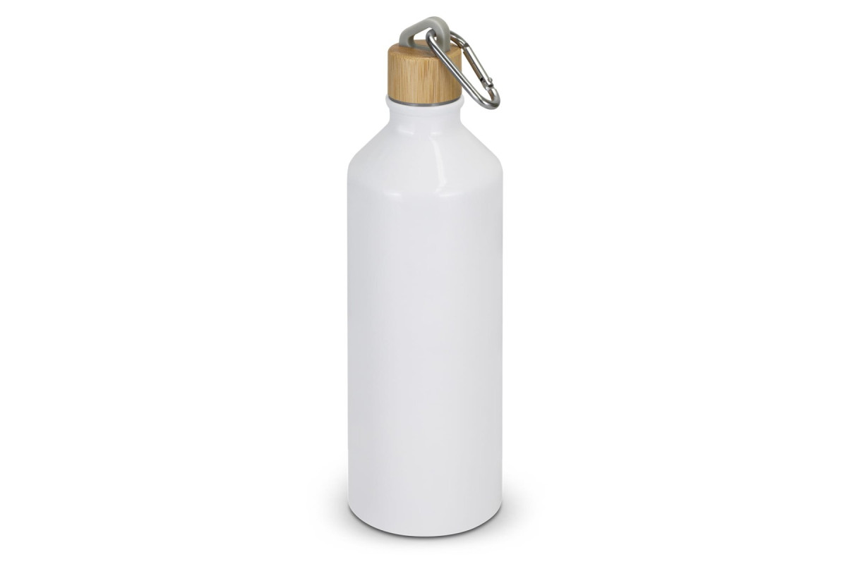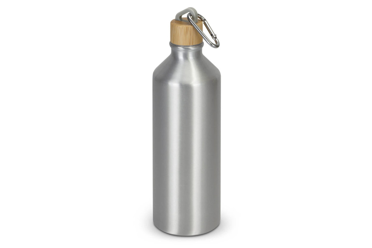 Lightweight 750ml aluminium bottle featuring a screw on bamboo lid with a carabiner. An optional natural gift box is available on request.