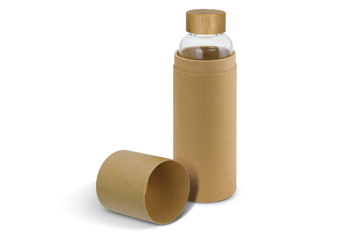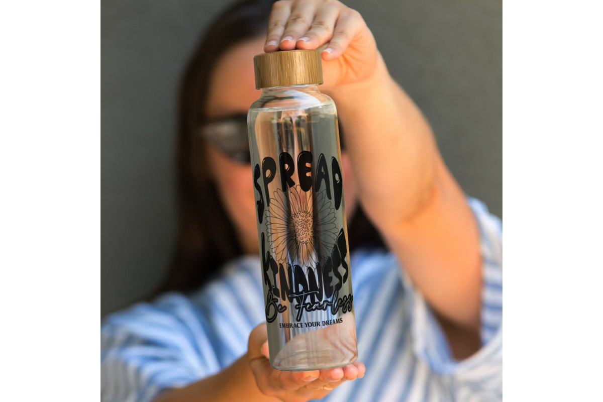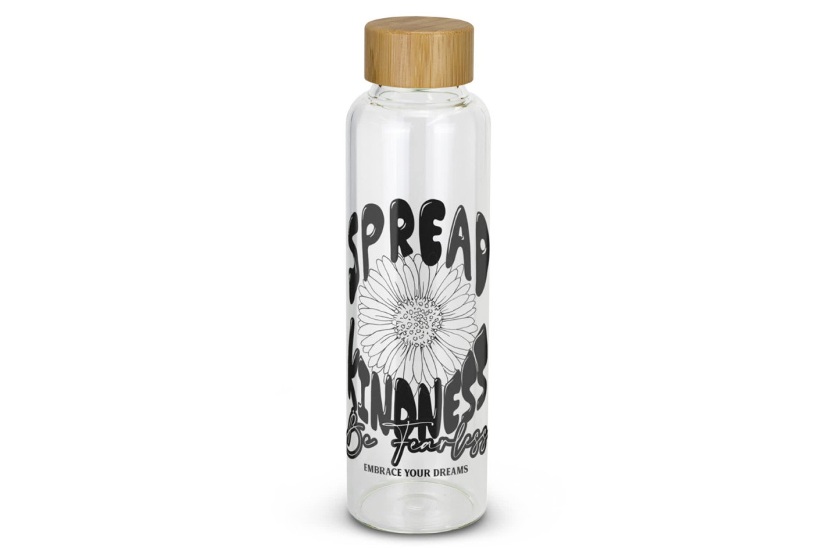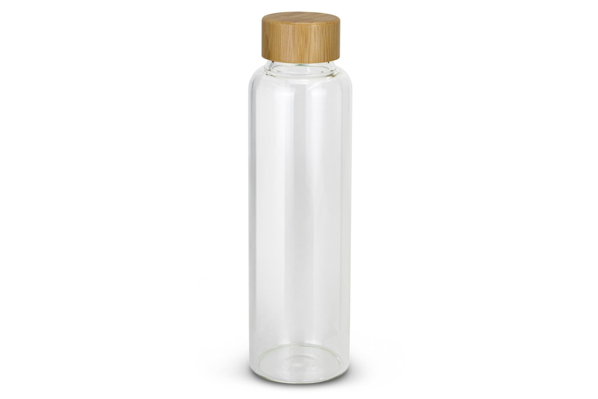 Sophisticated 600ml borosilicate glass drink bottle which has a trendy screw on bamboo lid.
