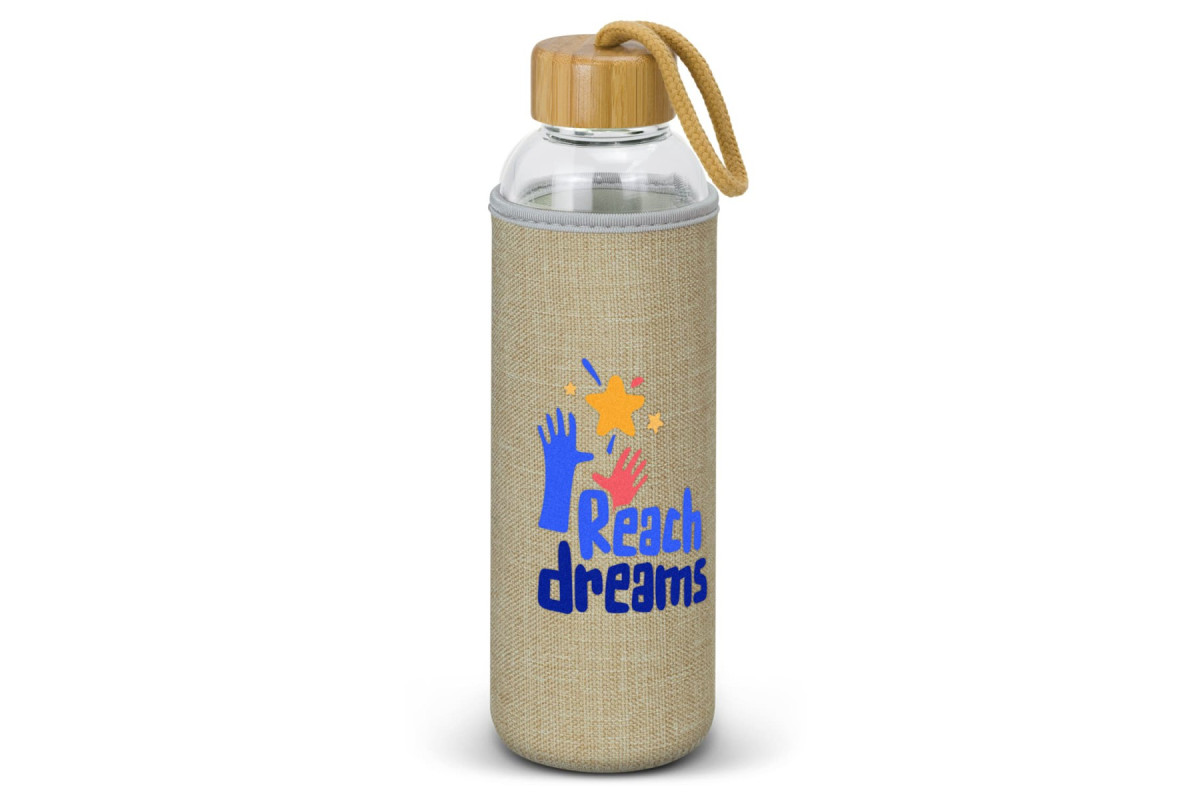 Stylish 600ml borosilicate glass bottle with a fashionable and insulating poly jute sleeve. Borosilicate is lightweight, exceptionally strong and is shatter-resistant. Eden is presented in a gift box or an optional gift tube.