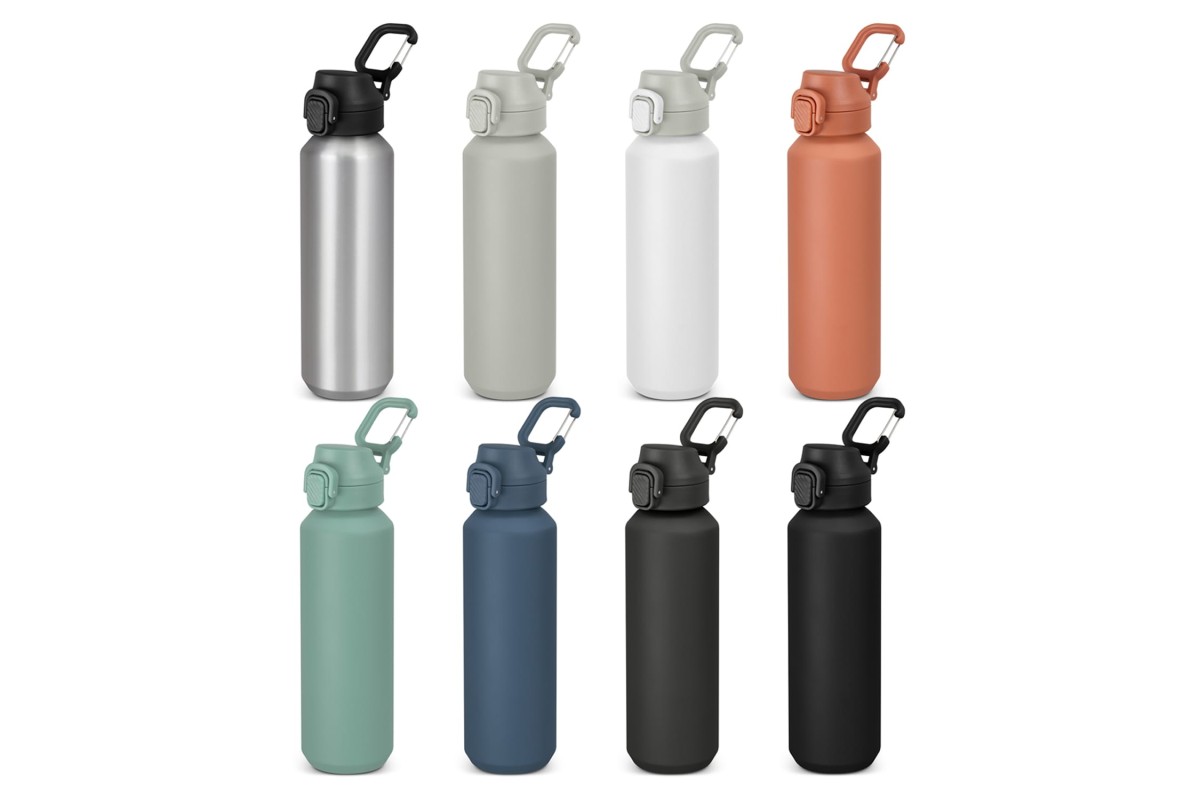 Extremely lightweight, BPA free, 600ml drink bottle made from recycled aluminium. It features a push-button cap with a secure lock mechanism and a built-in colour-matched carabiner for easy carrying or attachment to a bag. It is the perfect companion for work, travel, or outdoor adventures - practical and stylish.