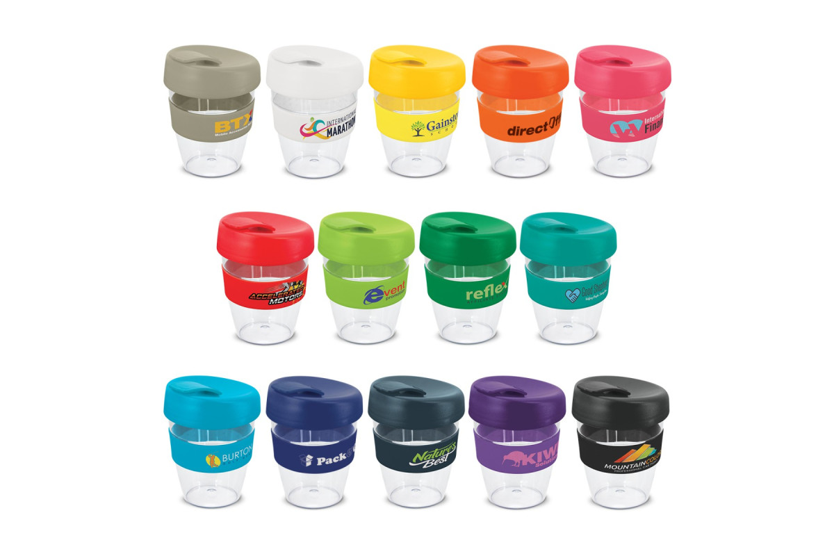 Crystal-clear 350ml reusable coffee cup with a heat-resistant silicone band and a secure screw on lid with a splashproof flip closure. The cup is manufactured from AS plastic and the lid is polypropylene. Both materials are BPA-free. The lid, flip closure and band can be mixed and matched in any colour combination from the standard colours at no extra cost. Up to five different colour combinations are included in the price and more are available for an additional charge. It can be presented in an optional natural gift box on request. This product is not dishwasher safe and handwashing is recommended. Express Cup Claritas is protected under New Zealand Design Registration No. 419451 and Australian Design Registration No. 361937. Features: * Crystal-clear 350ml reusable coffee cup * Mix and match: Lid, band and flip piece * Optional gift box and gift box sleeve available at an additional cost
