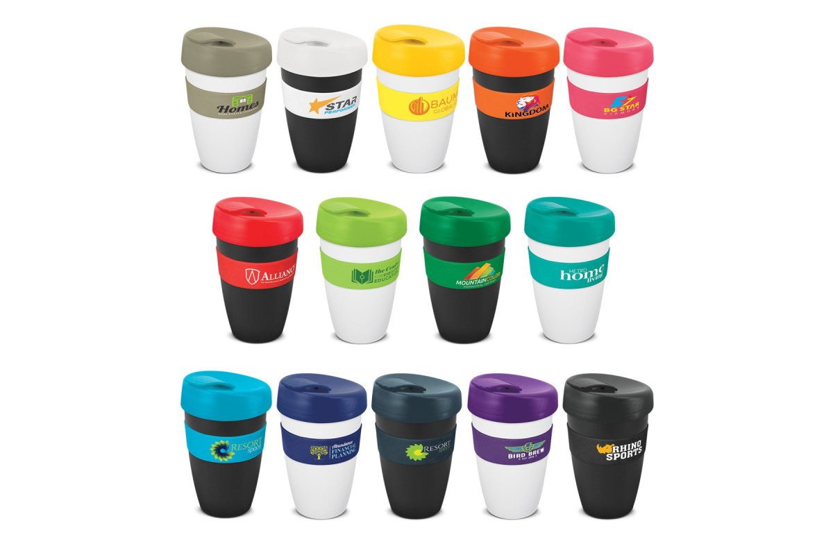 Large 480ml reusable coffee cup with a heat-resistant silicone band and a secure screw on lid with a splashproof flip closure. It is manufactured from polypropylene which is shatterproof, odour-resistant and BPA-free. The cup, lid, flip closure and silicone band can be mixed and matched in any colour combination from the standard colours at no extra cost. Up to five different colour combinations are included in the price and more are available for an additional charge. An optional natural gift box is available on request. This product is not dishwasher safe and handwashing is recommended. Express Cup Deluxe is protected under New Zealand Design Registration No. 419451 and Australian Design Registration No. 361937.