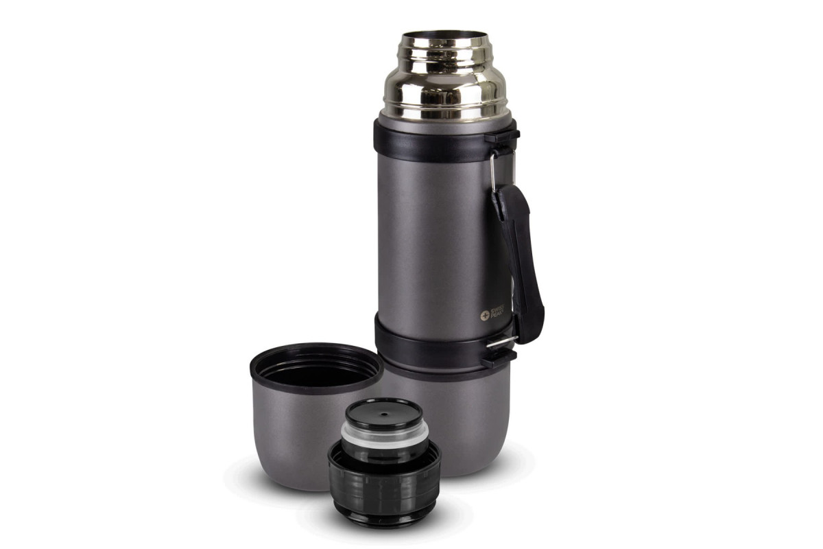 Swiss Peak has design and functionality in mind with this 700ml Vacuum flask. This Stainless steel double wall vacuum flask is paired with a hand grip. Fitted with two matching cups making for an optimal drinking experience. This flask is leak-proof, and handwashing is recommended. The Swiss Peak logo is located underneath the carry handle. Laser engraving on this product comes as a stainless steel finish. Presented in a premium Swiss Peak black gift box.
