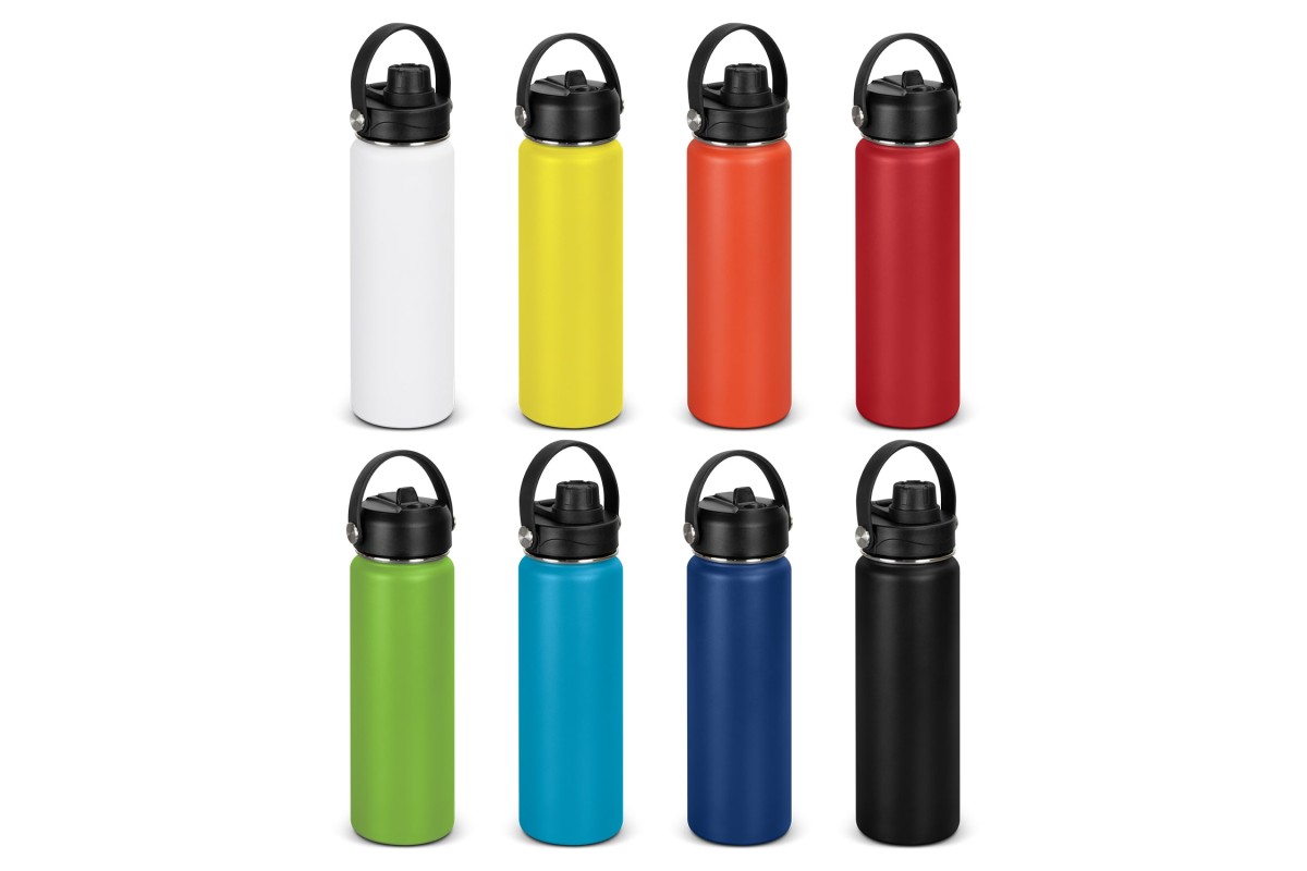 This BPA-free 800ml robust drink bottle is ideal for staying hydrated on the go. Combining stainless steel and polypropylene for a stylish drinking accessory. This double wall, vacuum insulated bottle features a powder coat finish and a secure screw on lid, with a choice of either a flip valve sipper, or a screw on chug cap. The Kinmont drink bottle blends practicality and style, highlighted by its carry handle and eye-catching silver rivet accents. This product is not dishwasher safe, and handwashing is recommended.