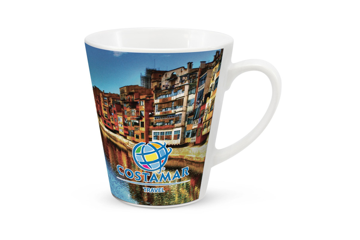 Latte style 300ml stoneware coffee mug that is manufactured for spot colour or full colour wraparound branding and is presented in a natural gift box. This product is not dishwasher safe and handwashing is recommended.
