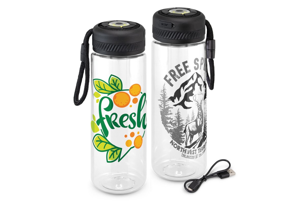 Technology-driven, 700ml water bottle that is manufactured from crystal-clear Tritan which is BPA-free, shatterproof and odour-resistant. It has a unique screw on lid with twin light functions that use radical COB (Chips on Board) technology to increase light intensity and battery life. Lumino can be used as a powerful torch or a lantern and it is easily recharged from a laptop, a power bank or a USB mains adapter. Other features include push button operation and a strong woven carry loop which can be attached to a bag. It is presented in a black gift box with a Micro-B USB cable and an instruction leaflet. This product is not dishwasher safe and handwashing is recommended.