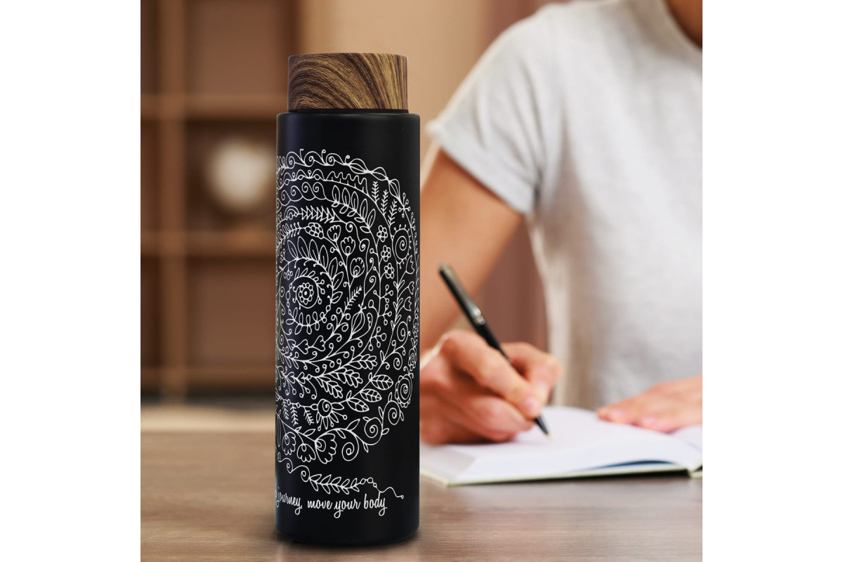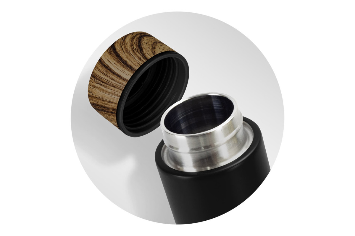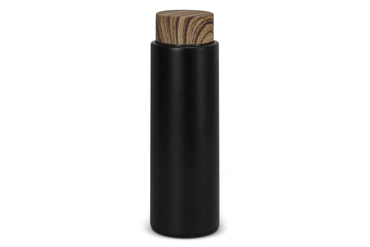 Elegant stainless steel vacuum bottle with a capacity of 480ml. Medina has a matte black body and a wood grained water transfer lid.