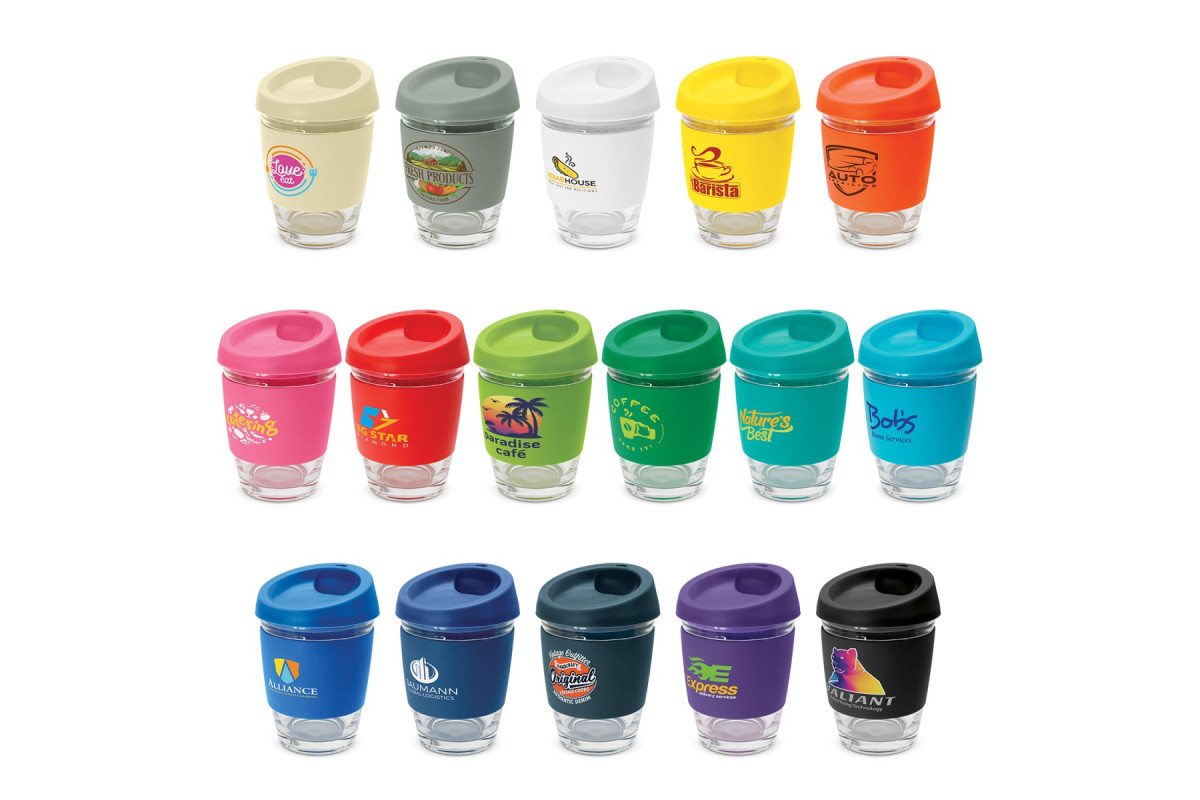 Fashion inspired 340ml reusable glass coffee cup with a secure push on silicone lid and a wide heat-resistant silicone band. The lid and band can be mixed and matched in any colour combination from the standard colours at no extra cost. The silicon band makes it easy to hold when containing hot coffee. Up to five different colour combinations are included in the price and more are available for an additional charge. Glass is a natural choice for a clean, pure taste and it is a reusable alternative to single-use paper cups. Metro Cup is presented in an unbleached cardboard gift box with a window to show the branding and product care instructions are printed on one side. An optional gift tube is available for presentation. This product is not dishwasher safe and handwashing is recommended.