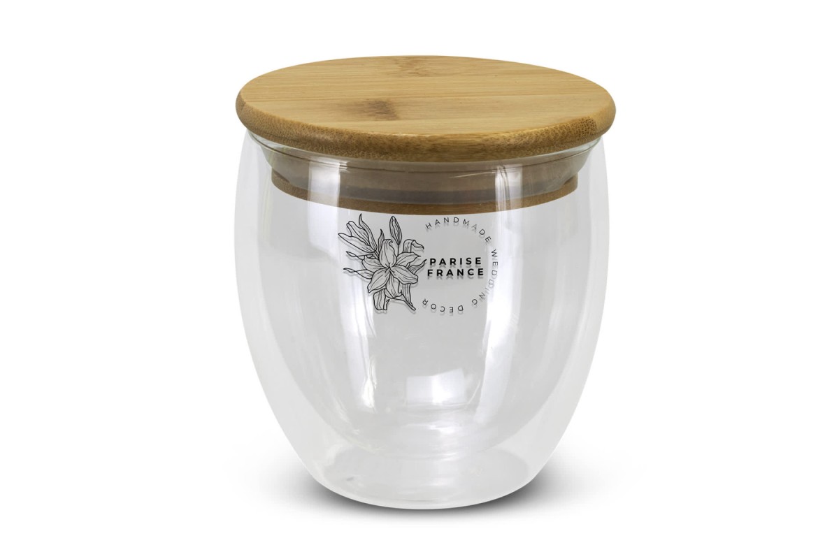 Stylish 250ml double wall, shatter-resistant borosilicate glass coffee cup featuring a natural bamboo lid with a silicone seal. Azzurra is presented in natural kraft gift box with NATURA branding.