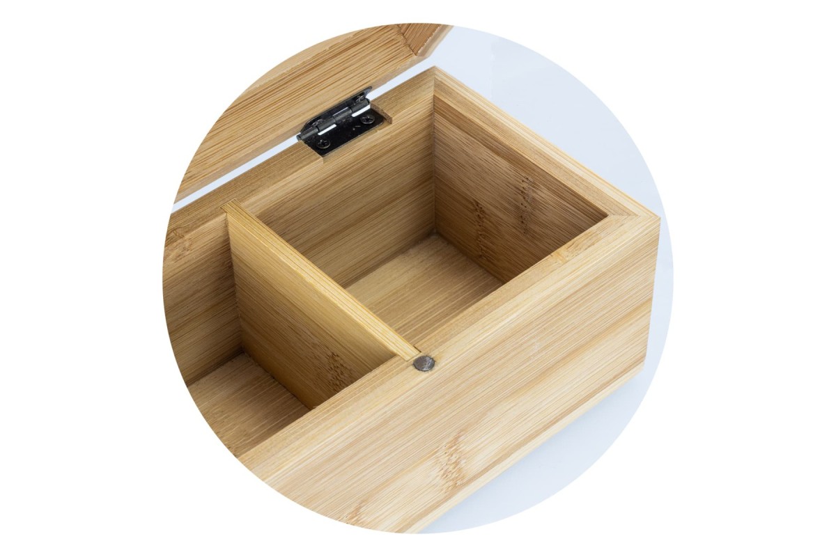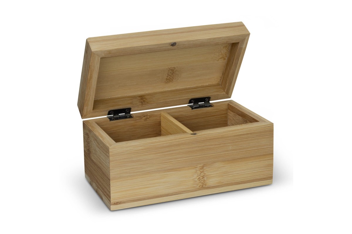 Useful tea storage box made from natural bamboo with two compartments and a hinged lid featuring a magnetic closure. The tea box is presented in natural kraft gift box with NATURA branding and is ideal for hospitality and gifting. Features: * Natural bamboo tea box with a hinged lid * Two compartments and a magnetic closure * Perfect for hospitality and gifting * Presentation: Natural kraft guft box with NATURA branding