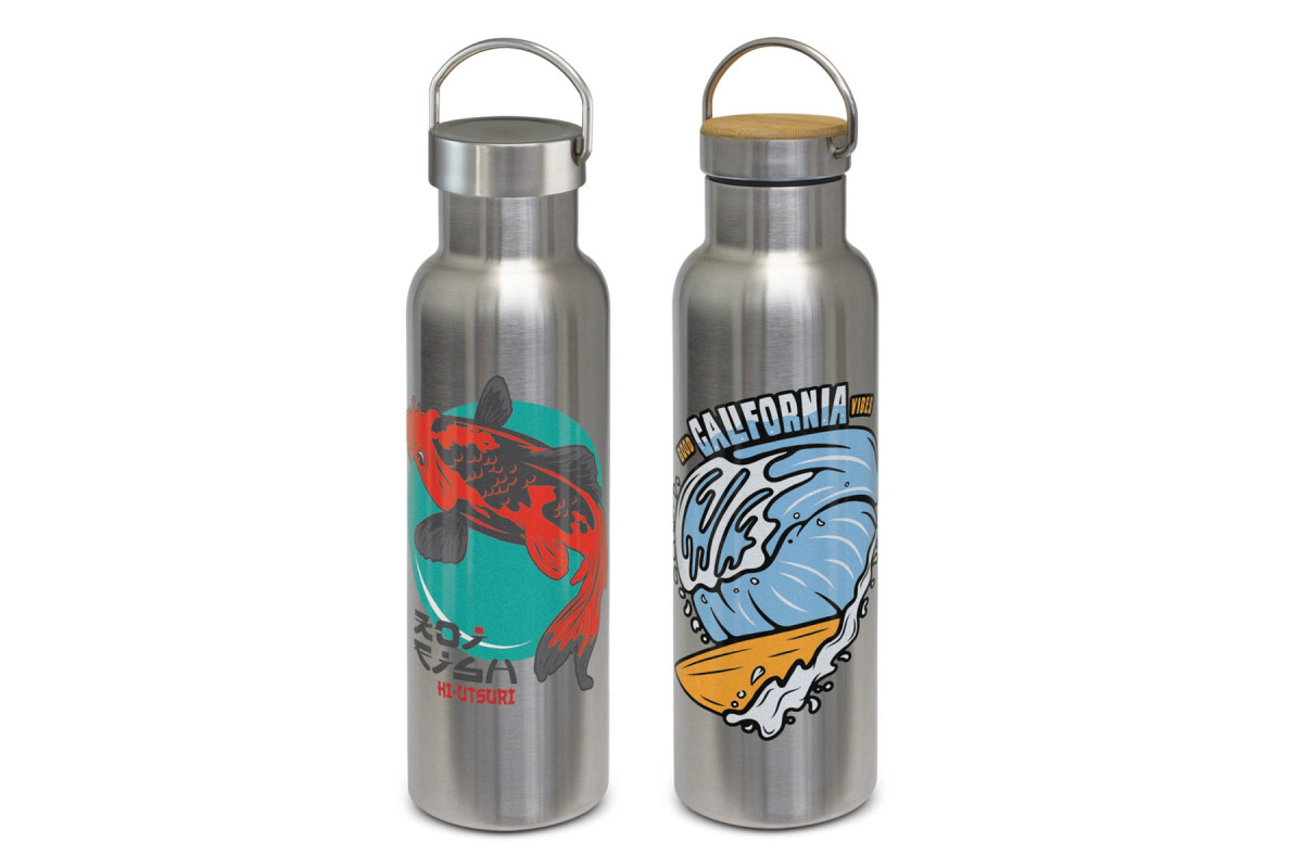 Impressive 650ml BPA-free double wall vacuum insulated stainless steel drink bottle which will keep drinks cold for 24 hours or hot up to 12 hours. It has a trendy screw on lid with a stainless steel carry handle that offers a prominent branding opportunity and is available in full stainless steel or with a bamboo veneer. Bamboo is a natural material that produces unavoidable variances in the grain pattern, colour and branding. The lid and bottle laser engrave to a natural etch. It is nicely presented in a black gift box or an optional gift tube. This product is not dishwasher safe and handwashing is recommended.