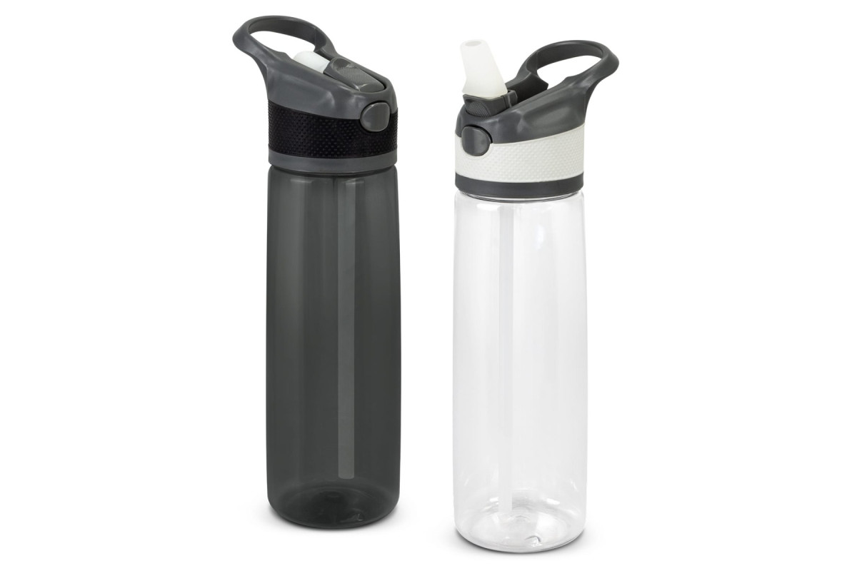 Timeless 800ml water bottle which has a secure screw on lid that has a carry handle. Rover is manufactured from PET plastic which is durable and lasting. Other features include a push button release for the flip-out drinking valve with a straw. This product is not dishwasher safe and handwashing is recommended.
