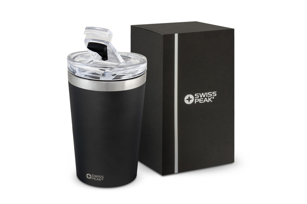 Timeless Swiss Peak design is very evident in this smart 350ml vacuum cup. Its double wall vacuum insulation will keep drinks hot or cold for longer and the tough powder coating laser engraves to shiny steel finish. This BPA-free cup has a secure screw on transparent Tritan lid with a leak resistant flip closure that locks open when in use. It is beautifully presented in a Swiss Peak gift box with an information leaflet included. This product is not dishwasher safe and handwashing is recommended. Features: * 350ml double wall vacuum insulated cup * Tough powder coated finish * Screw on Tritan lid * Leak-resistant flip closure that locks open when in use * Presentation: Black gift box with Swiss Peak branding