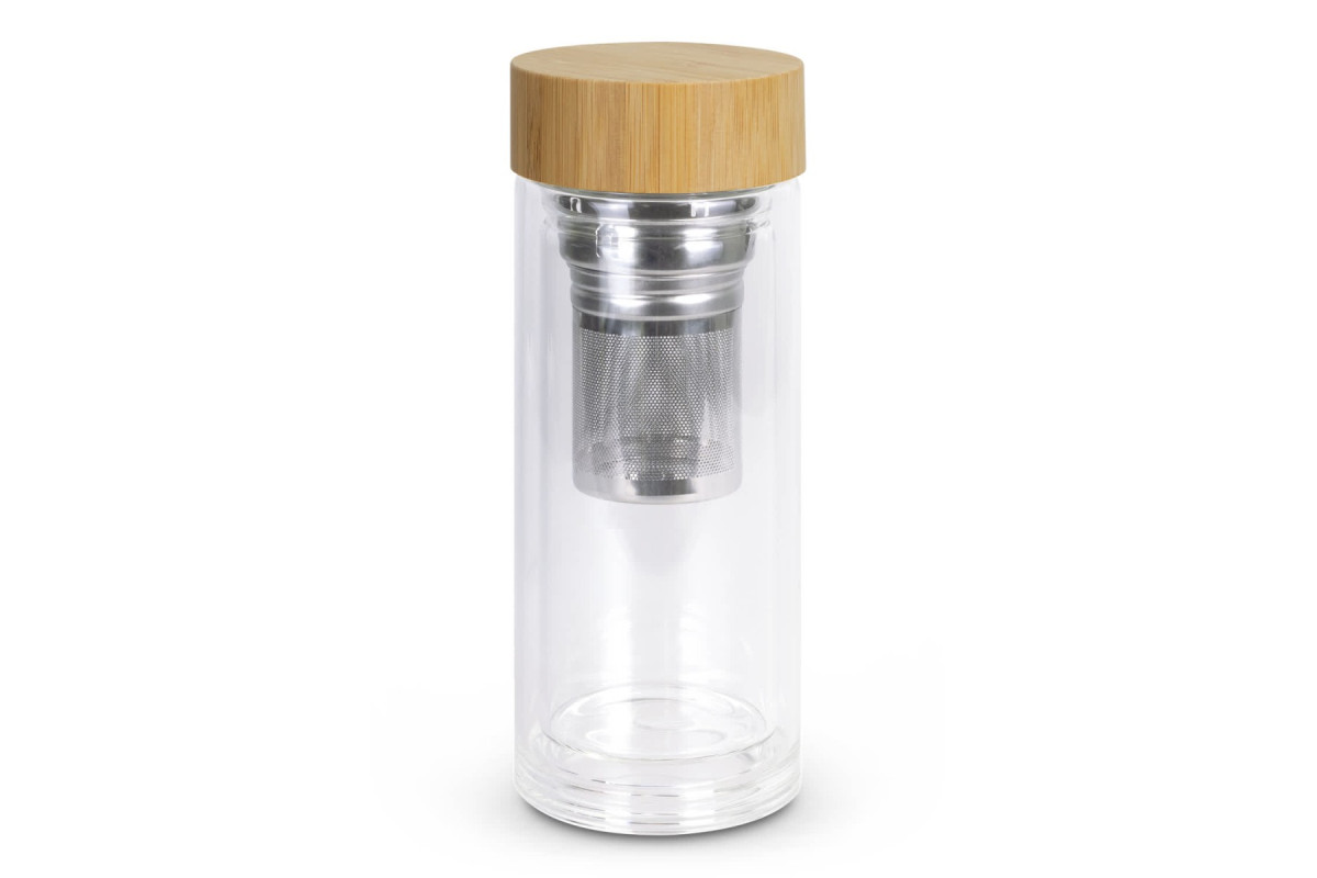Elegant 350ml, double wall borosilicate glass bottle which maintains hot or cold drink temperatures for longer and remains comfortable to hold. It has a removable stainless steel infuser for tea or fruit and a secure screw on bamboo lid. The bottle is BPA-free and is manufactured from borosilicate glass which is incredibly light and very strong. Bamboo is a natural material which produces unavoidable variances in the grain pattern, colour, and branding. This product is not dishwasher safe, and handwashing is recommended.