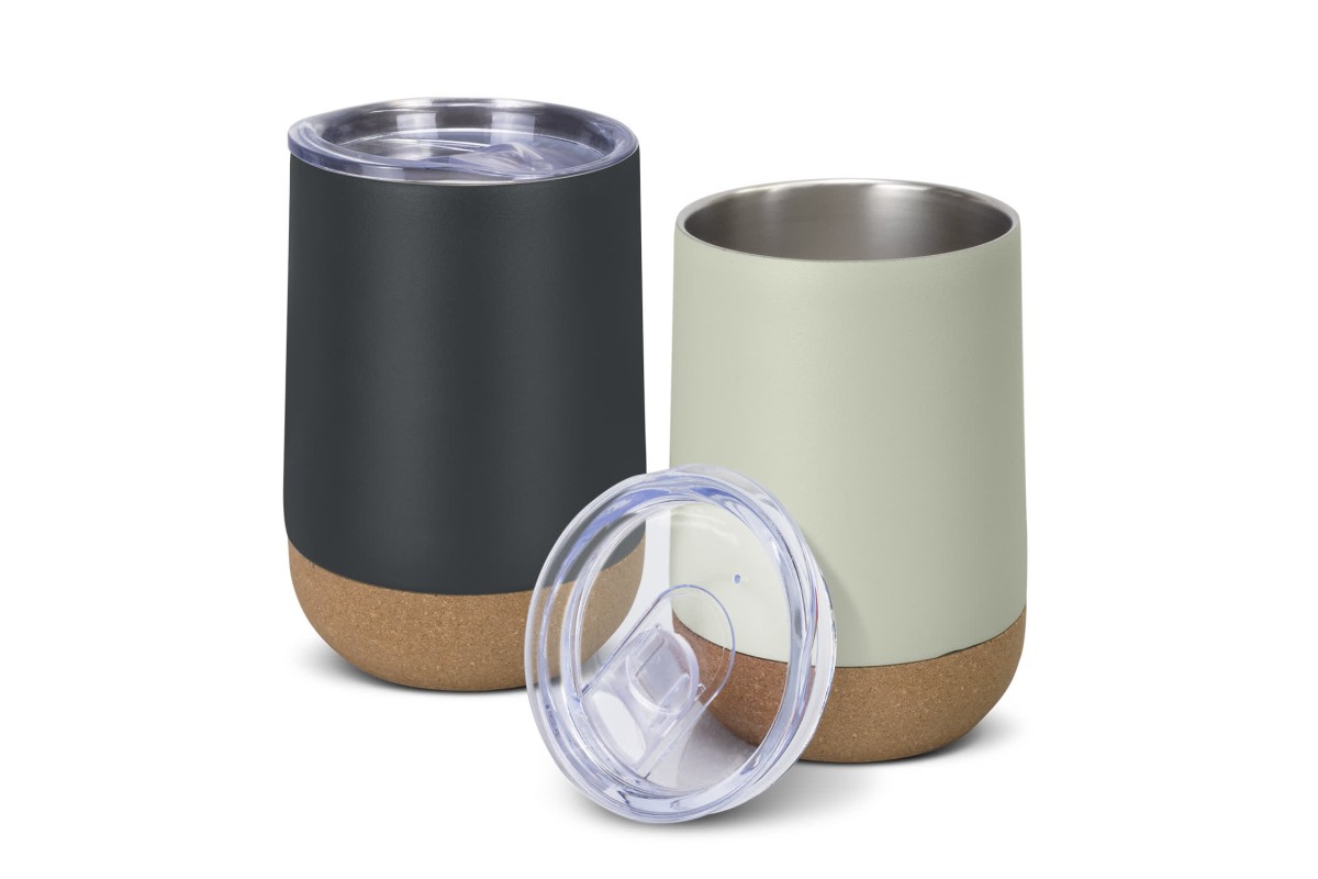 Chic 300ml double wall, vacuum insulated stainless steel cup with a tapered design and a non-slip natural cork base. Vixen features a tough powder coating and a secure push on lid with a sliding closure. The cup is BPA-free, laser engraves to a stainless steel finish and is presented in a natural gift box.