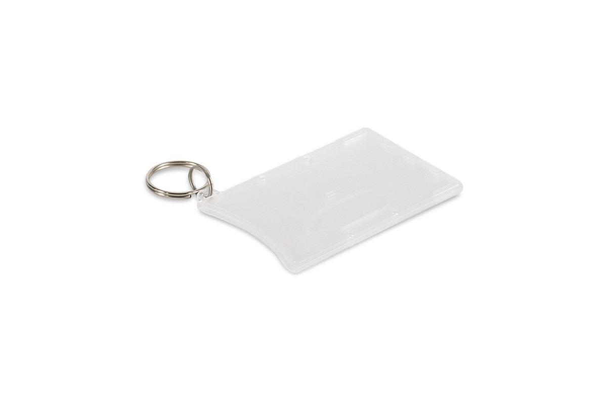 Single plastic card holder with a convenient key ring and a thumb slot on the back so the card can be easily removed. It is ideal for credit cards, ID cards, fuel cards and membership cards.