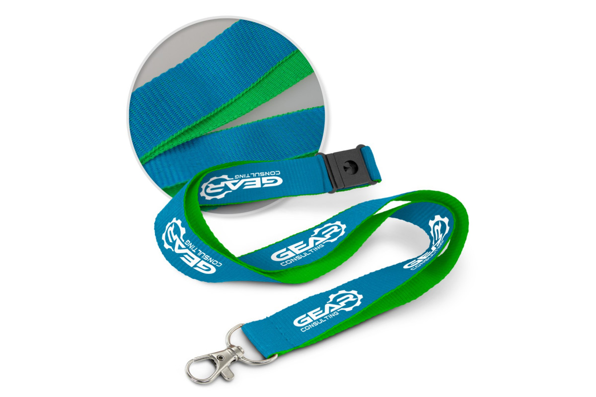 20mm wide polyester lanyard which is customised with different coloured material on each side to produce a two tone effect. The lanyard has a metal clip and a safety clip with other attachments available on request. A production lead time of 25 working days applies to this product by air freight and larger orders can be sea freighted on request to reduce the freight cost.
