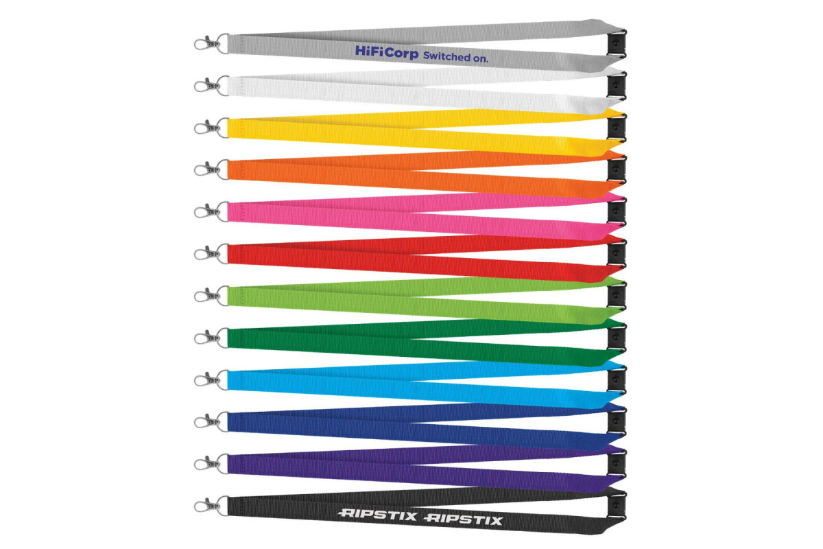 20mm wide polyester lanyard with a metal clip and a safety clip. It can be branded in one colour on one side.