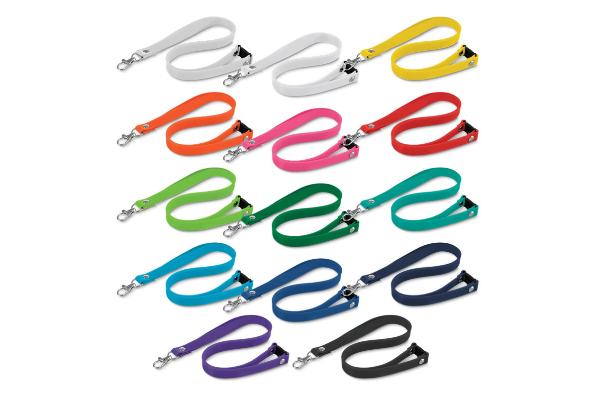 Unique 15mm wide silicone lanyard with a spring loaded metal clip and a safety clip. A production lead time of 25 working days applies to this product by air freight and larger orders can be sea freighted on request to reduce the freight cost.