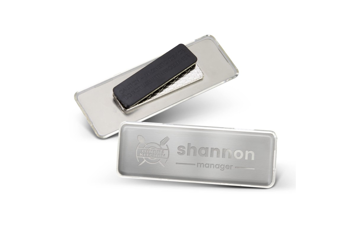 Rectangular metal name badge that features a magnetic back for easy attachment. The metal plate can be engraved for permanent, personalized name tags, or you can use the removable plastic cover to easily swap out names, making it a versatile option for staff or event use. Features: * Rectangular metal name badge with magnetic backing * Metal plate can be engraved for permanent branding * Removeable plastic cover included
