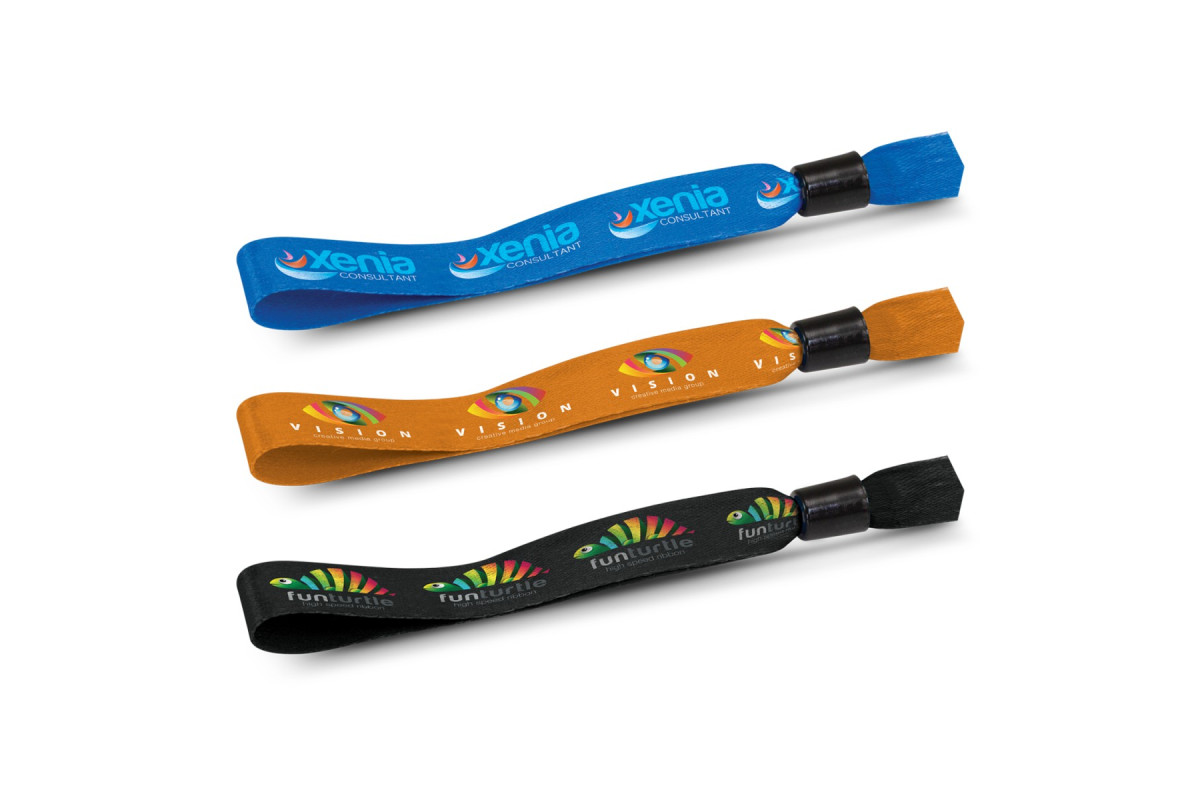 Polyester wrist band that can be branded in full colour. The wrist band has a unique one-way toggle and once it is slid into place the only way to get the wrist band off is to cut it with scissors. It is ideal for entry to events as it is very visible and cannot be reused. A production lead time of 25 working days applies to this product by air freight and larger orders can be sea freighted on request to reduce the freight cost.