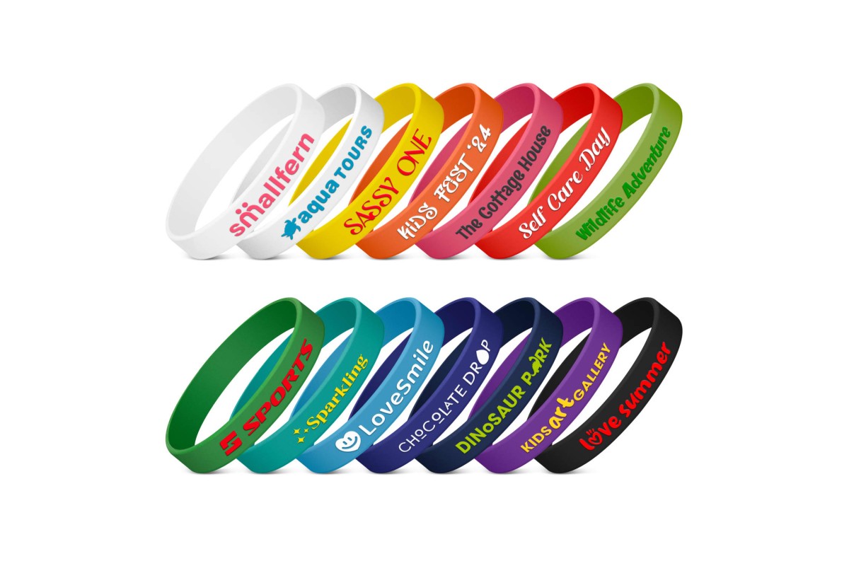 Silicone wrist bands have many uses and are ideal for fundraising, awareness campaigns, promotion and as admission bracelets for events. There are 14 standard colours and PMS colours are available on request. They are branded with embossing which raises the logo above the surface. All or part of the raised surface can be printed with one colour which is optional. One size fits all and they can be supplied in an optional polybag, with or without a full colour label. A production lead time of 20 working days applies to this product by air freight. Features: * Silicone wrist band ideal for events and promotions * 14 standard colours with PMS colours available on request * Embossing branding which gives a three-dimensional effect above the surface * One size fits most * Can be supplied in an optional polybag with or without a full colour label * Production lead time of 20 working days by air freight