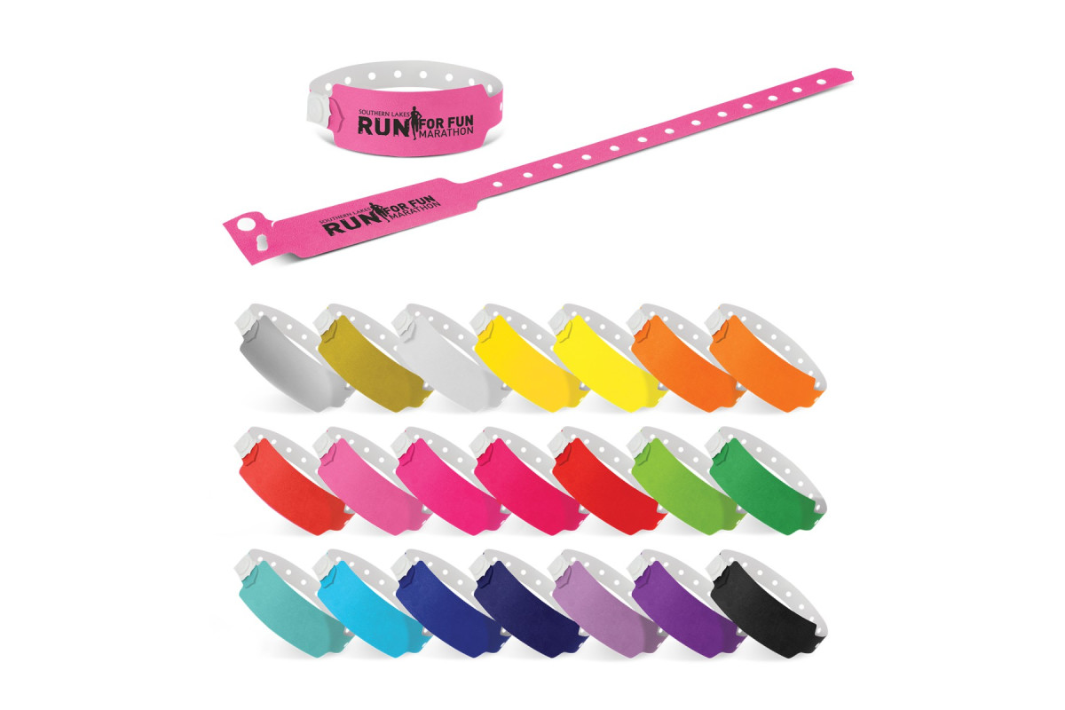 Tough tamperproof, snap lock wrist band manufactured from tri-laminate plastic which is waterproof and stretch-resistant. It is designed for crowd management at multi-day events, rugged outdoor events and events where water is involved. They are available either branded or unbranded in 21 different colours with optional custom numbering. A production lead time of 20 working days applies to this product by air freight and larger orders can be sea freighted on request to reduce the freight cost.