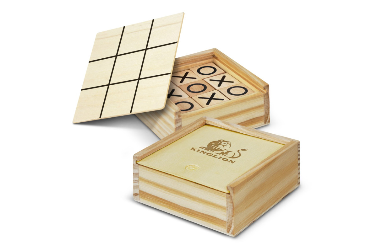 Classic game of Tic Tac Toe where each player tries to be the first to have three noughts or crosses in a row. The game is presented in a pine wood box with a sliding lid which has the game grid printed on the underside. Wood is a natural material which produces unavoidable variances in the grain pattern, colour and branding. It laser engraves to a natural etch.