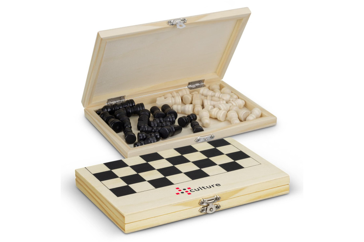 Deluxe Travel Chess Set manufactured from pine wood. Wood is a natural material that produces unavoidable variances in the grain pattern, colour and branding.