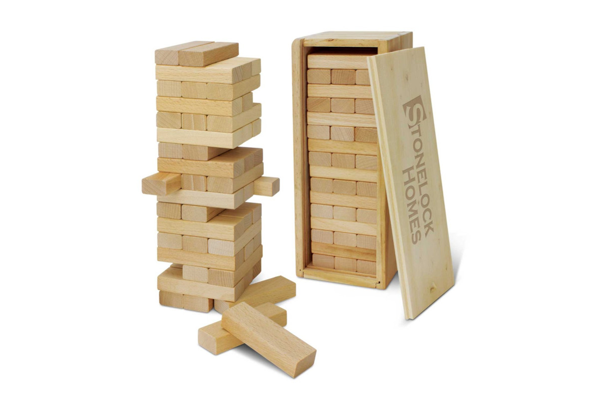 Tumbling Tower is a game of physical skill where a tower of 48 wooden blocks is constructed and players take turns removing one block at a time without causing the tower to fall. The game is beautifully presented in a wooden box with a tower stacker and instructions. Wood is a natural material which produces unavoidable variances in the grain pattern, colour and branding.