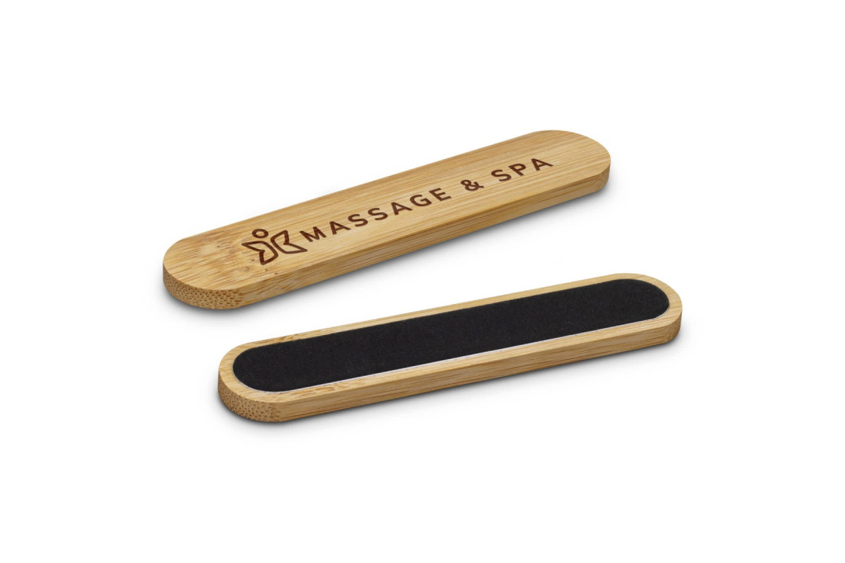 Handy Bamboo Nail File with black emery board which provides a coarse filing surface. Bamboo is a natural material and because the plant is fast growing, it places less demands on natural resources and produces a material that is durable and versatile. Bamboo can also produce unavoidable variances in the grain pattern, colour and branding.