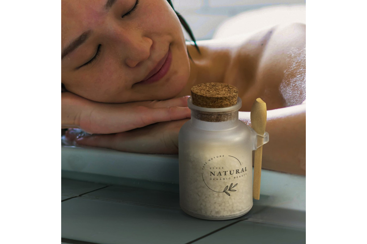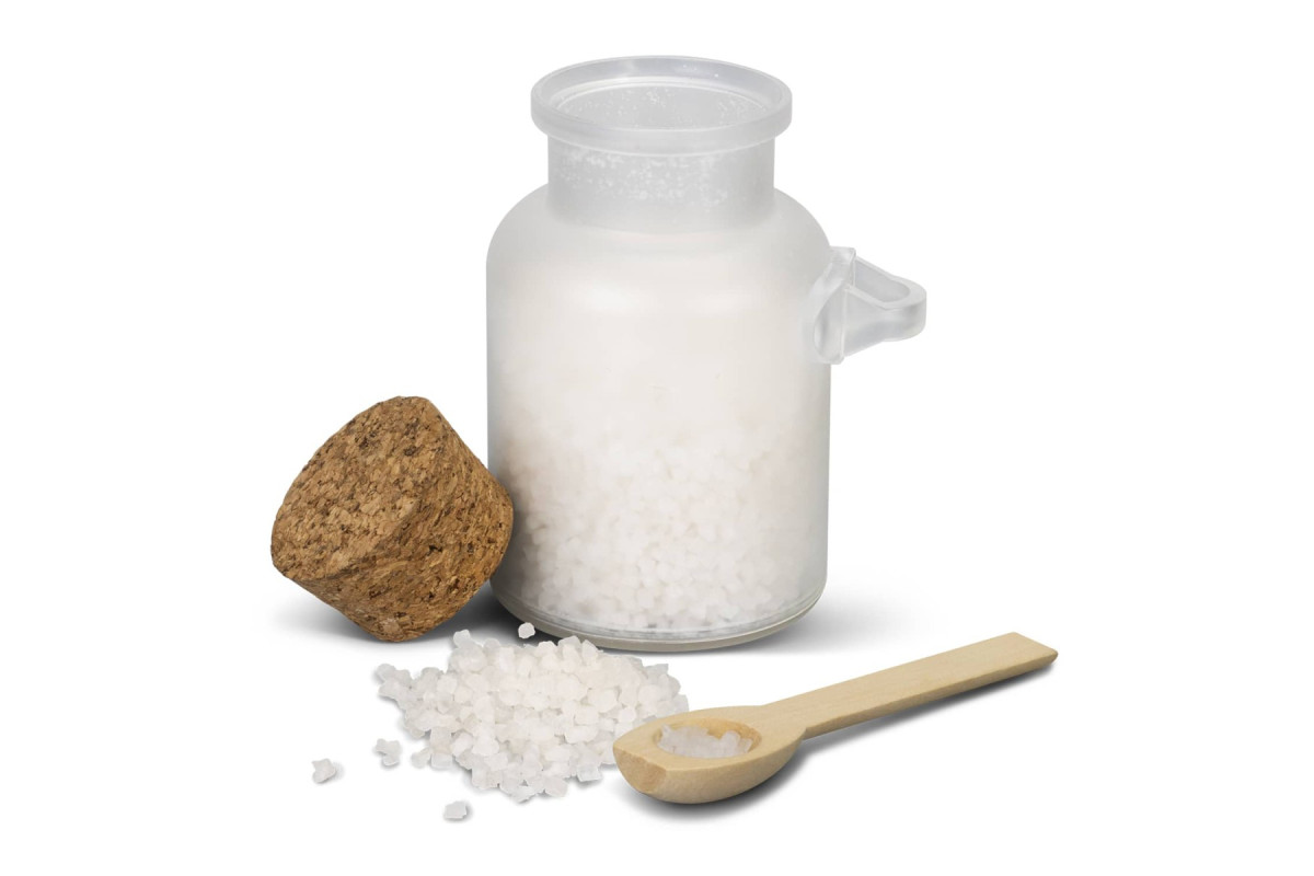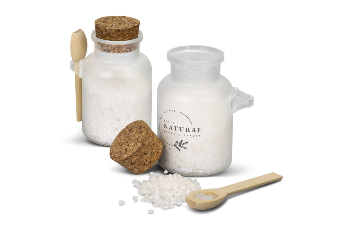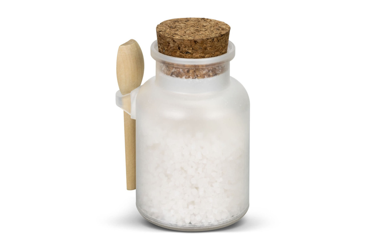 200g of relaxing vanilla-scented bath salts, presented in a stylish jar with a natural cork lid and a dispensing wooden spoon.