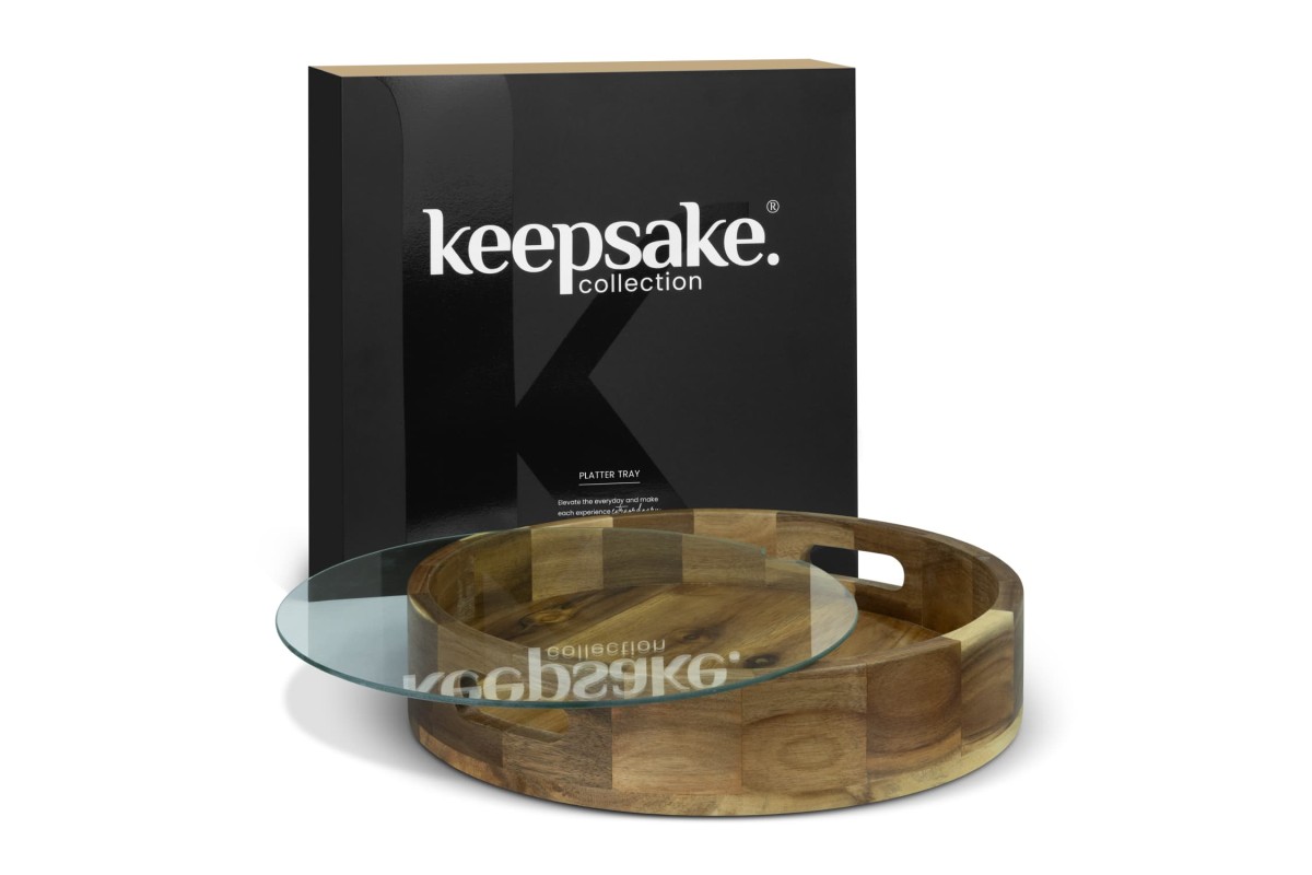This elegant serving tray, with a generous 350mm diameter, enhances any formal occasion with a touch of sophistication. The deep-set wooden handles showcase meticulous craftsmanship, with each acacia panel featuring unique variations in grain and colour. The tempered glass insert combines both style and practicality, being easily removable for cleaning and dishwasher-safe. Whether you aim to impress your dinner guests or seek a refined addition to your home decor, this stylish serving tray is an ideal choice. Features: * Large acacia wooden tray with handles for serving * 350mm diameter * Removable clear tempered glass insert for easy clean * Glass includes a thumb insert for quick removal * Great for hosting dinners * Glass is dishwasher safe * Presentation: Natural gift box with Keepsake branded sleeve