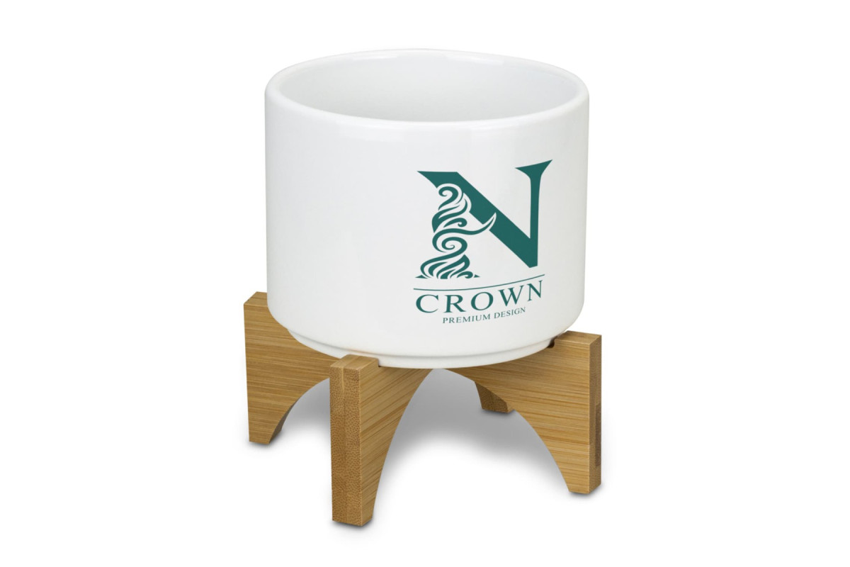 Modern ceramic planter pot with bamboo base and legs for extra height which is suitable for indoor plants. The pot does not have a drainage hole. It is presented in an individual kraft box. Bamboo is a natural material and because the plant is fast growing, it places less demands on natural resources and produces a material that is durable and versatile. Bamboo can also produce unavoidable variances in the grain pattern and colour.