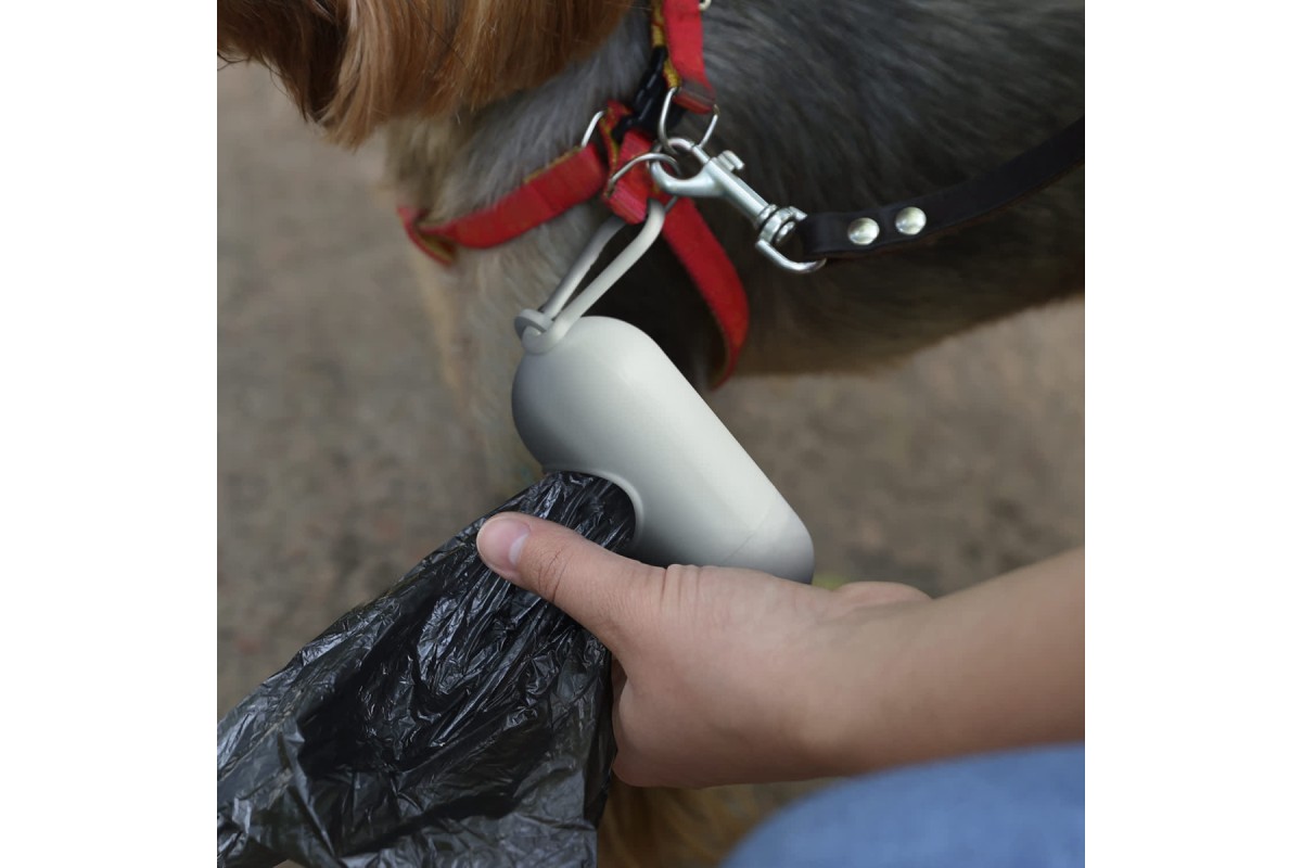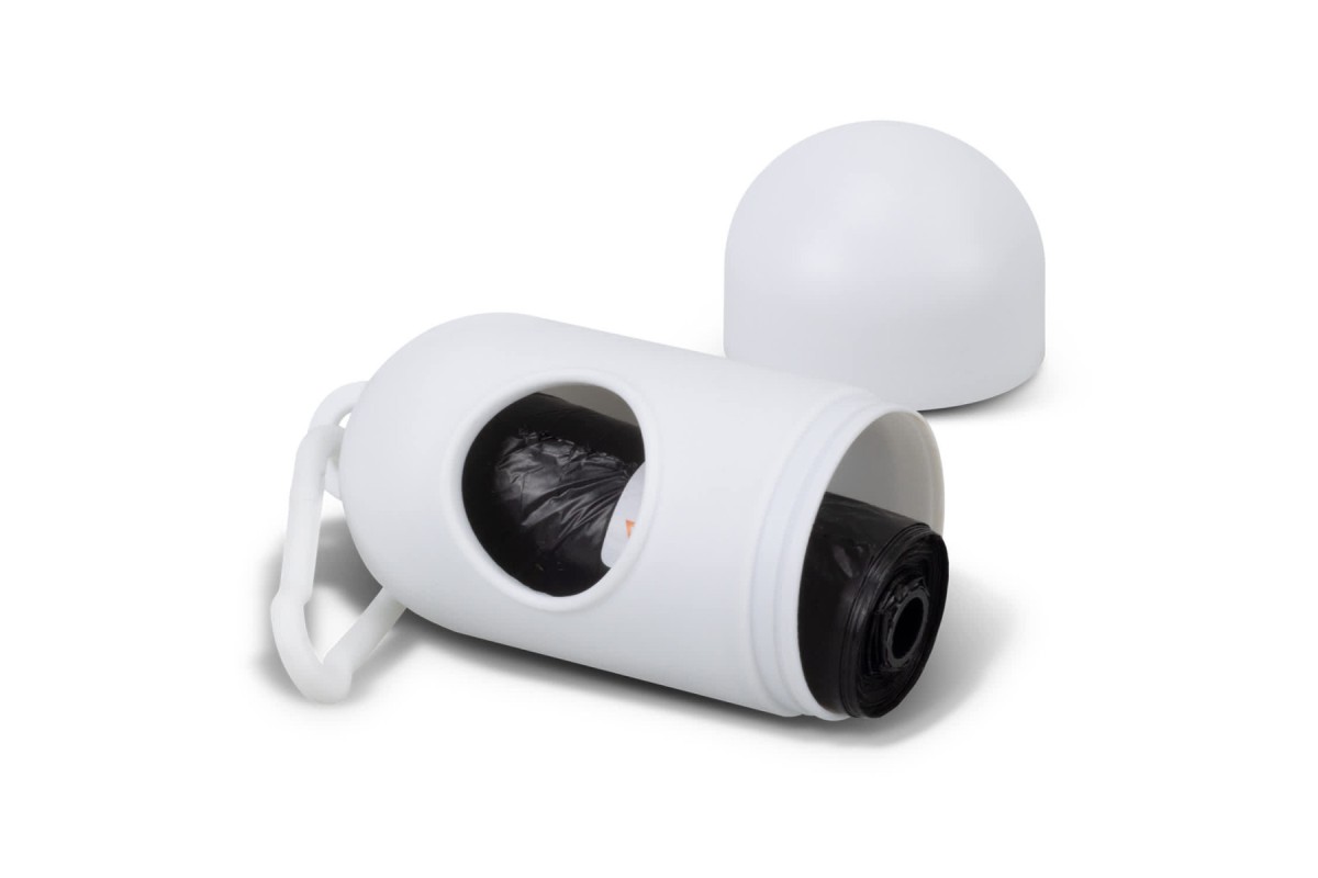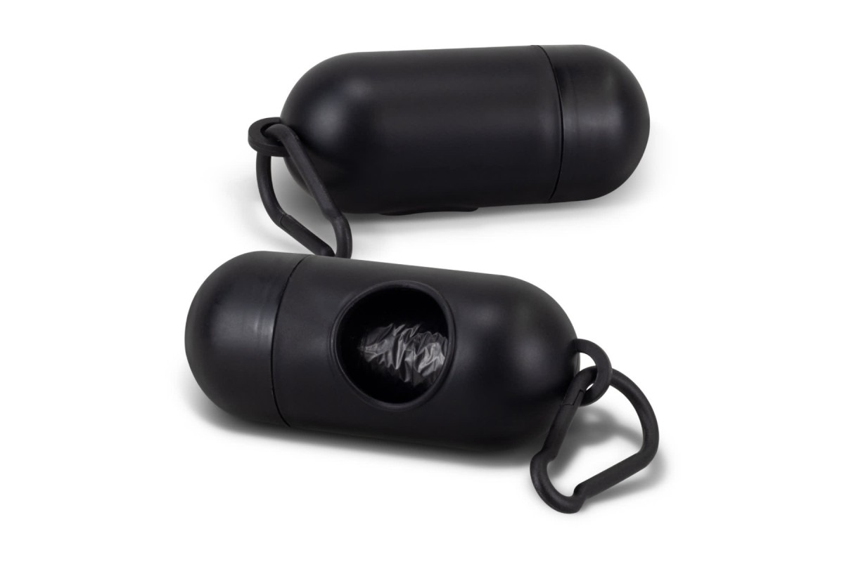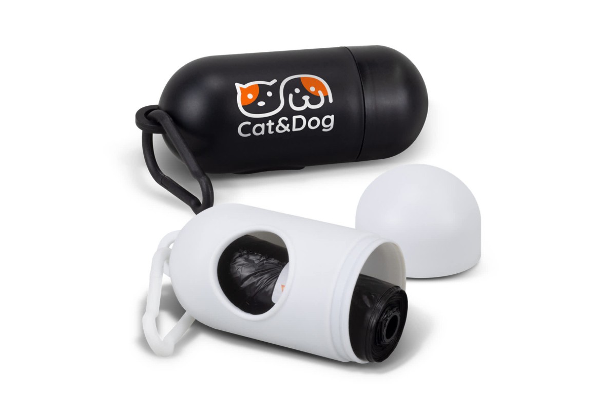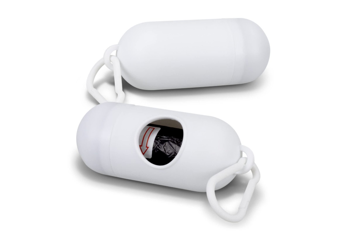 Handy pet waste bag dispenser made from polypropylene with a useful clip for attaching to bags, collars and leads. The dispenser features a pop-open lid and includes 15 waste bags made from polyethylene.
