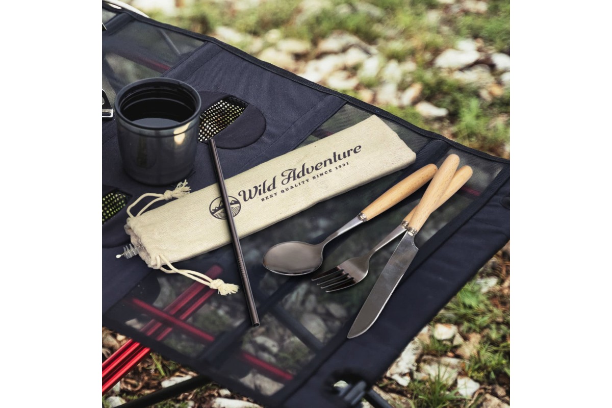 Reusable stainless steel cutlery set stored in a convenient drawstring bag. This set is made from stainless steel and rubberwood which includes a knife, fork, spoon, straw, and straw cleaner.